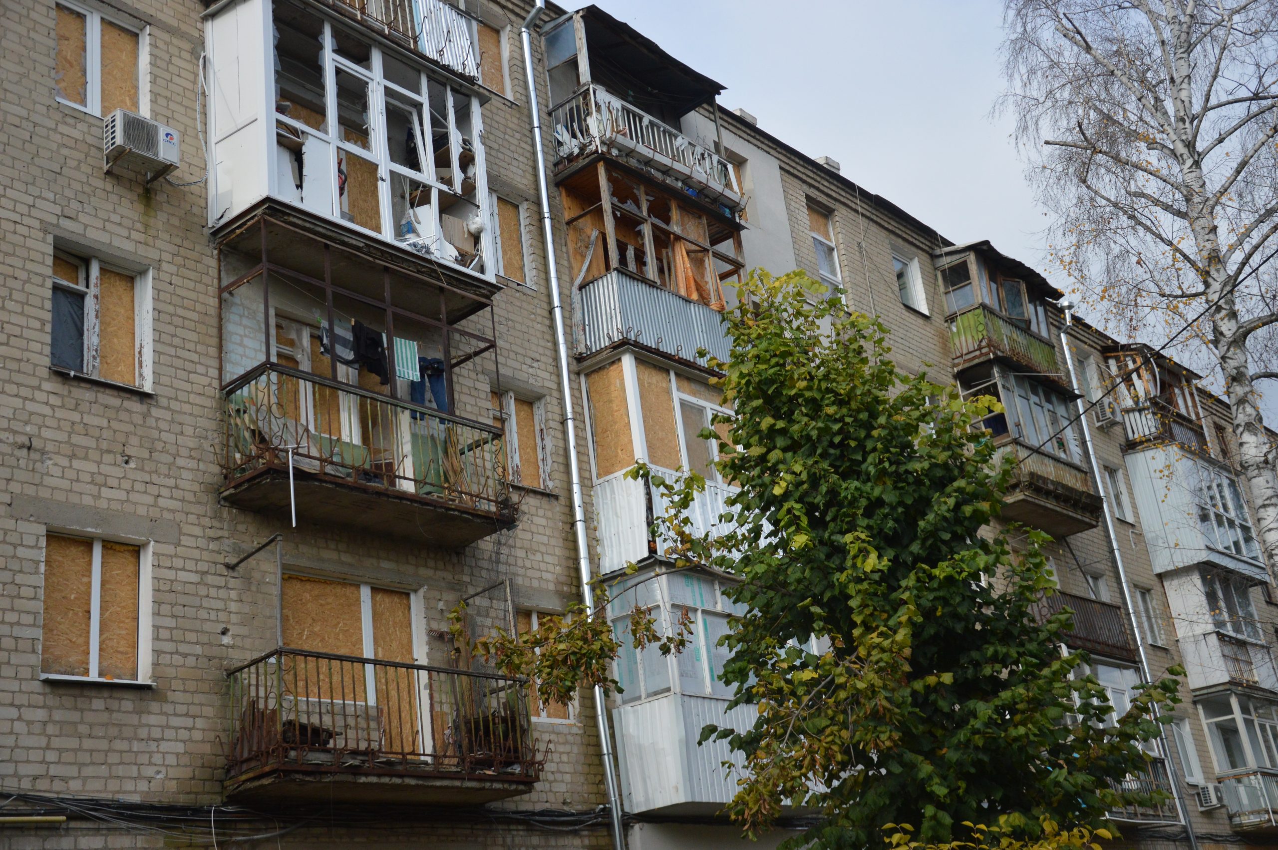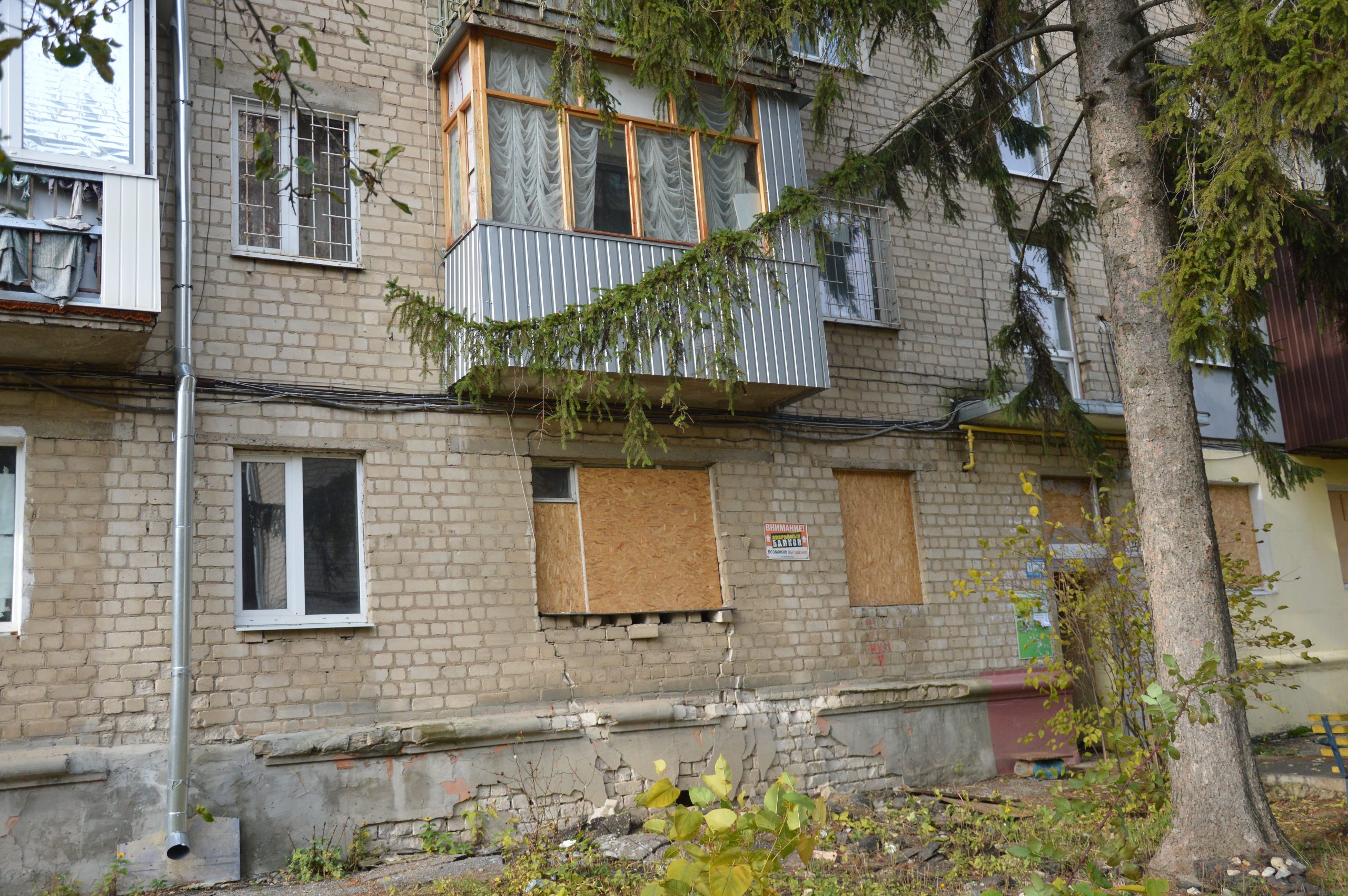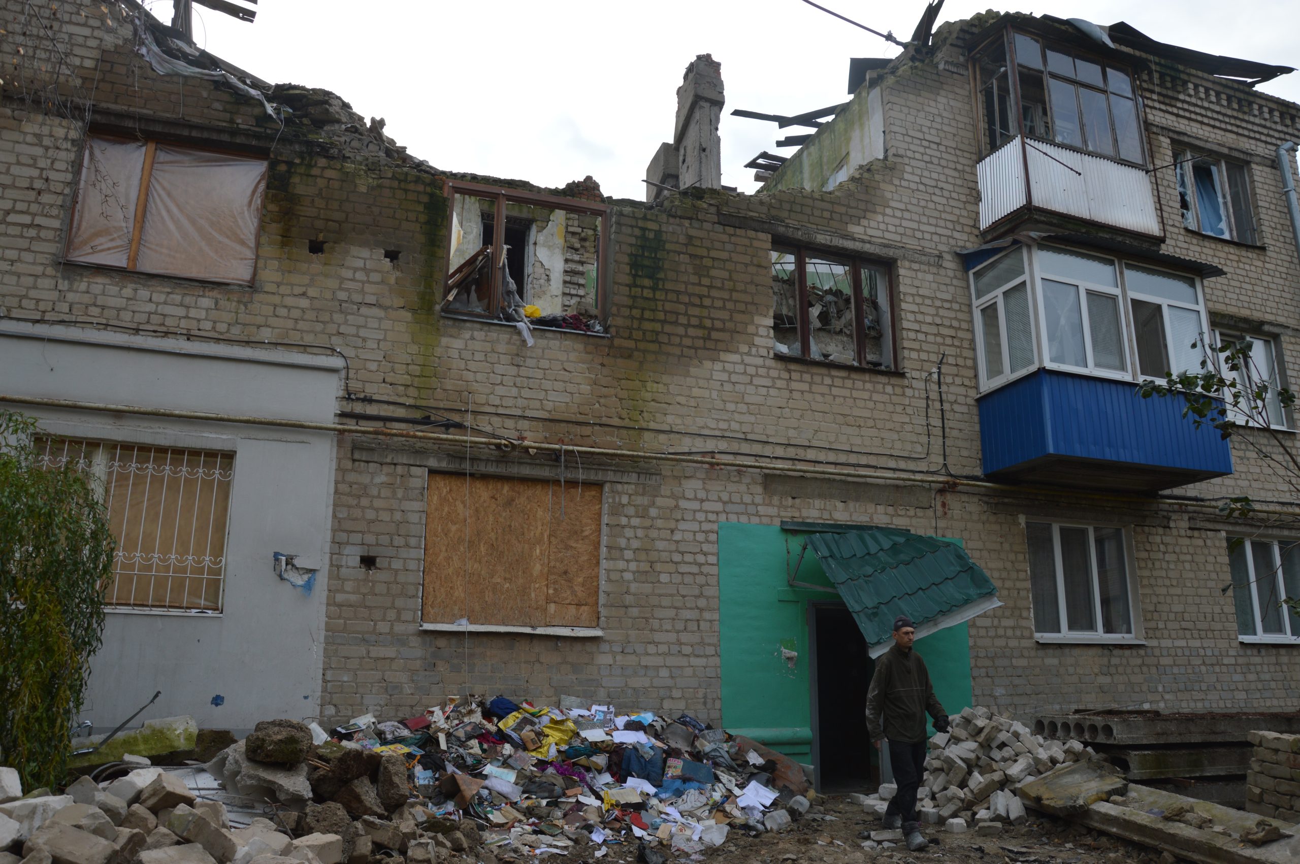 From the outside, it may seem that the building is intact, there are just no windows. But in reality, it has large holes in the roof and destroyed apartments on the upper floors. In this building, the inhabitants will not be able to spend the winter due to broken heating pipes. During the summer and the autumn, water flowed and flooded the apartments, which did not have time to dry.