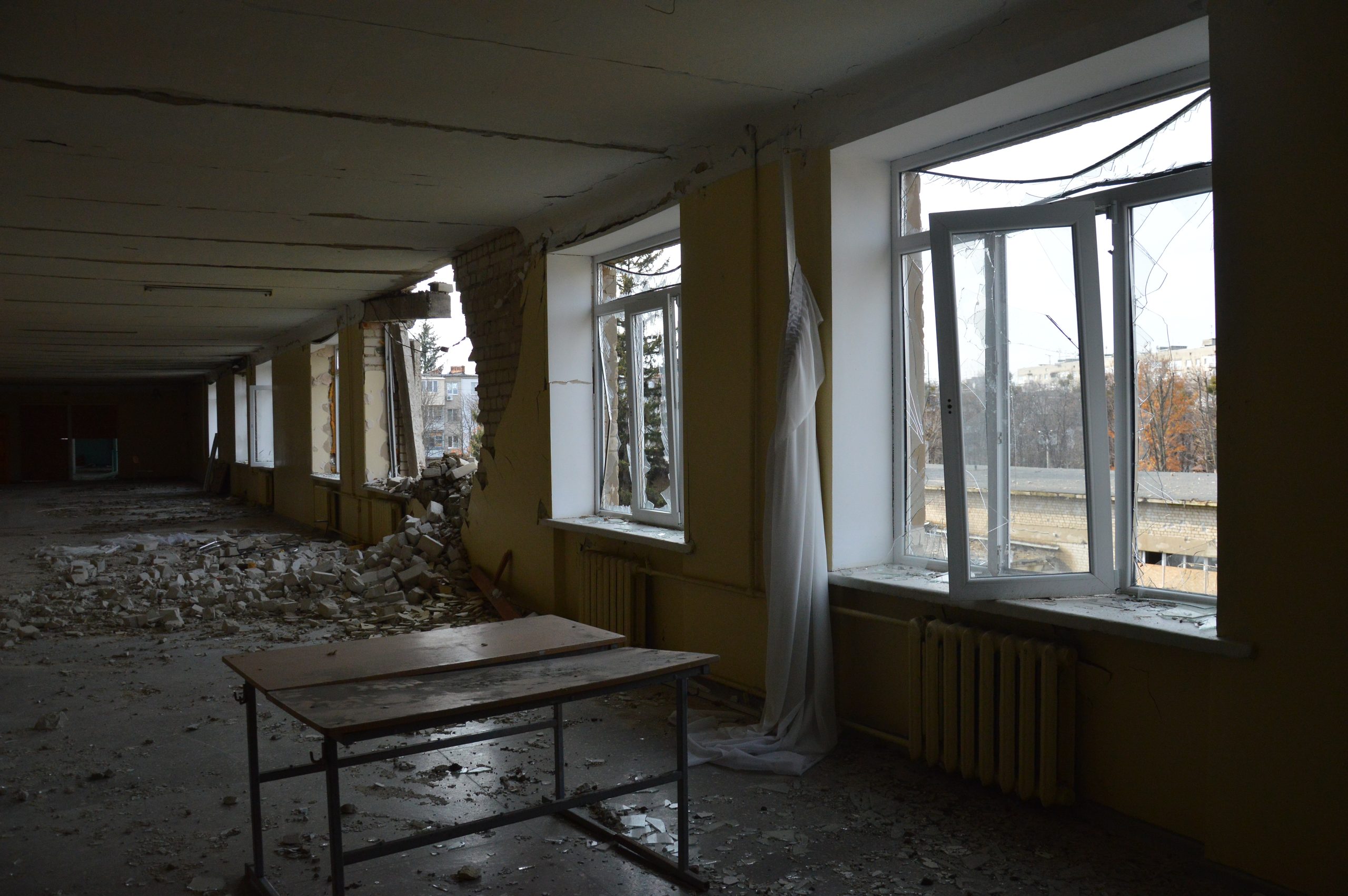 [Andriy Tagayev and Natasha Tagayeva, volunteers]: The school was also bombed. There was massive shelling here, very heavy damage to the building, extensive destruction on the third floors of the school. Ironically, the class was taught in Russian. It was just this very class that was hit, from the whole school. There, even the roof above it has caved in, there are practically no unbroken windows left in the school, the roof is all broken.