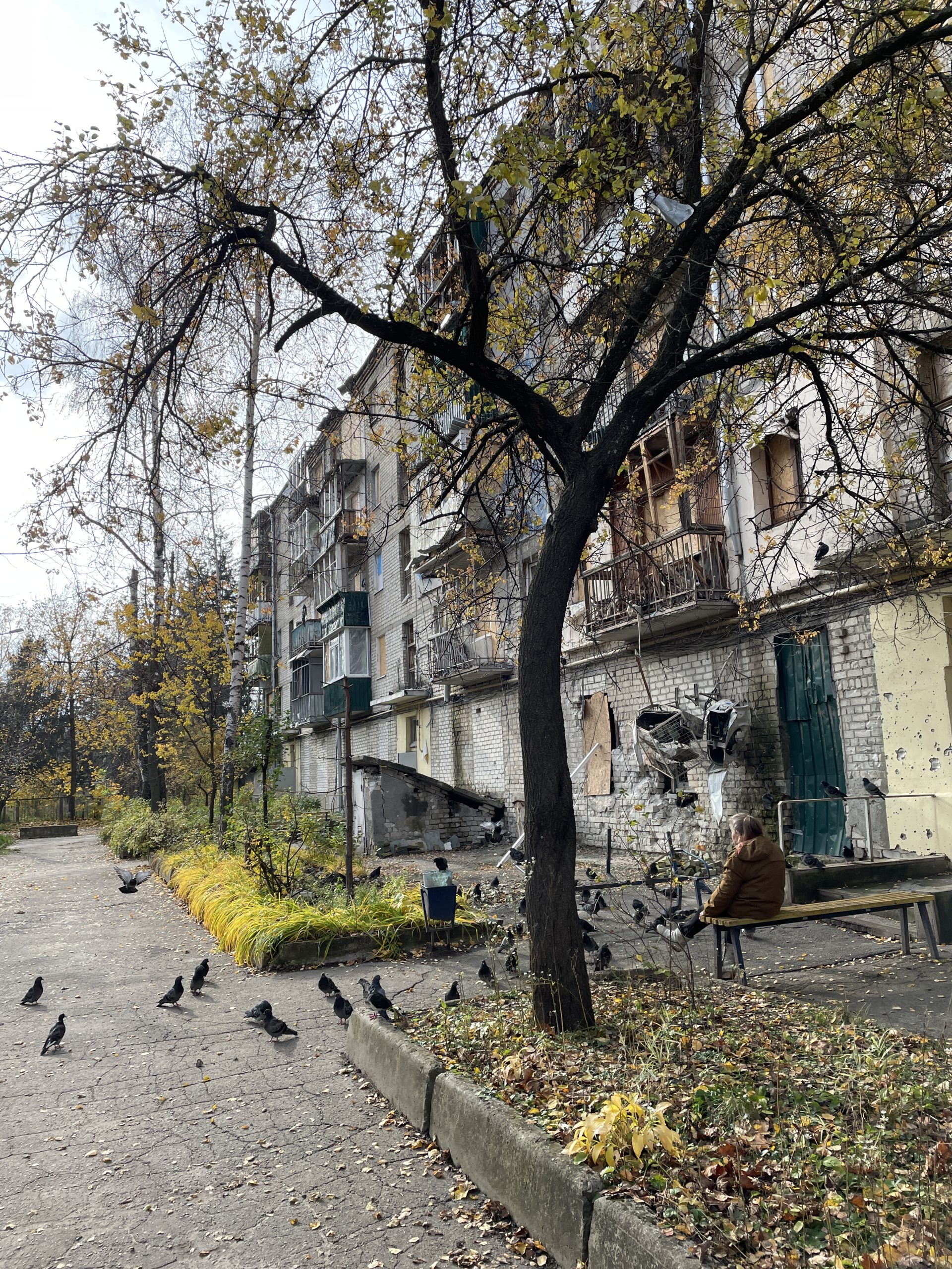 Destroyed apartments on the first floors, a house damaged by debris and a lonely elderly woman, one of the few on the entire street. There is almost nothing to do in the city, especially for the elderly, but most of those who remain simply have nowhere to go.