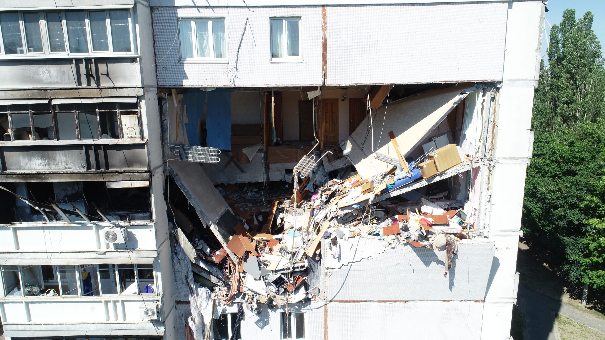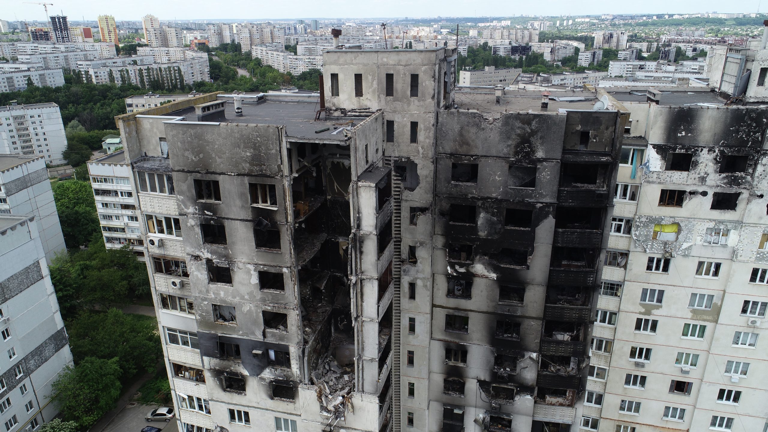 Kharkiv. Destroyed apartment building in North Saltivka residential district. As seen from the drone on Jun 7, 2022.