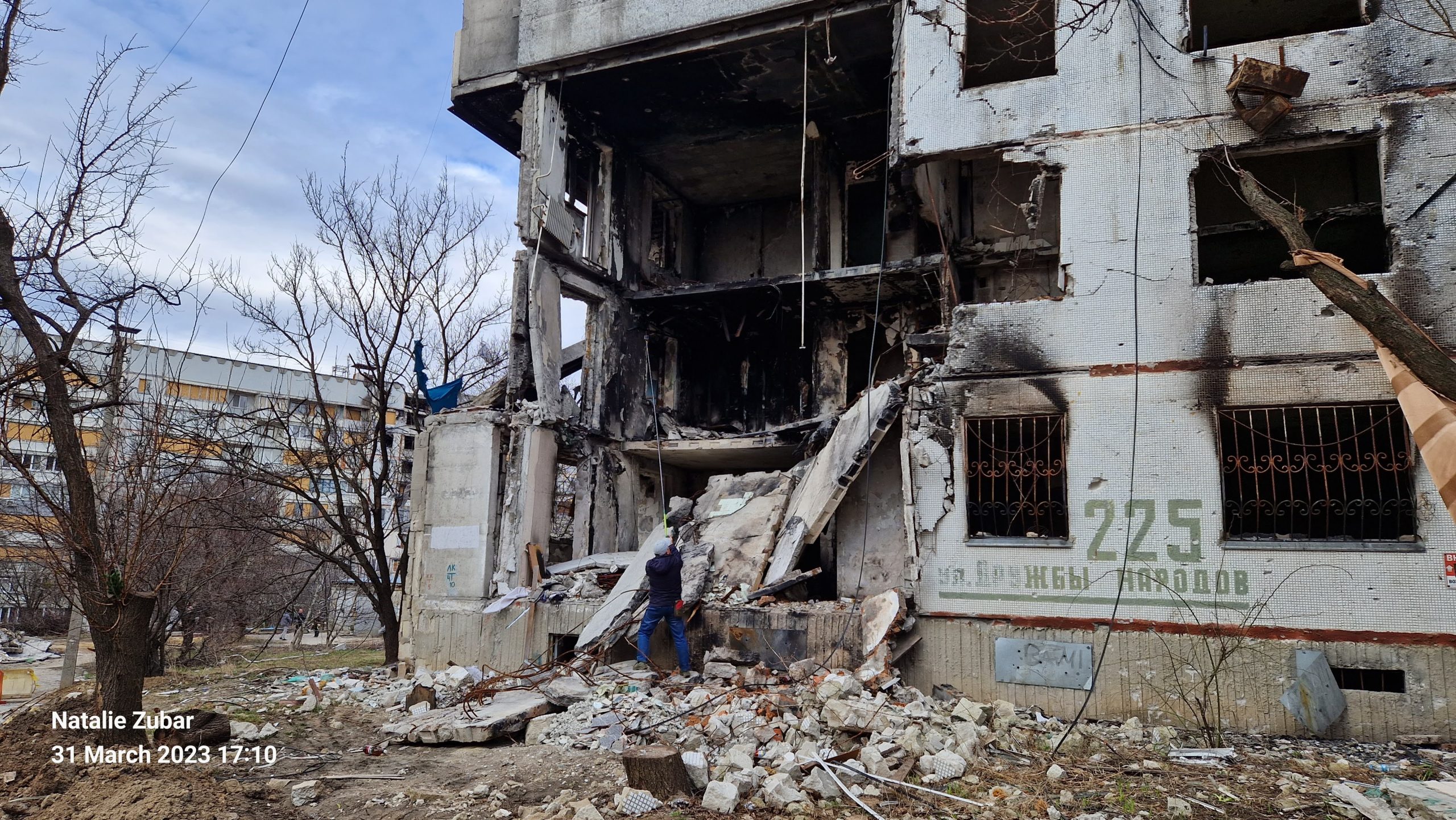 A destroyed apartment building in North Saltivka, Kharkiv with the remnants of the address on the wall, which is translated as “Friendship of the Peoples Street #225”. Photo was taken on March 31, 2023 by Nataliya Zubar.