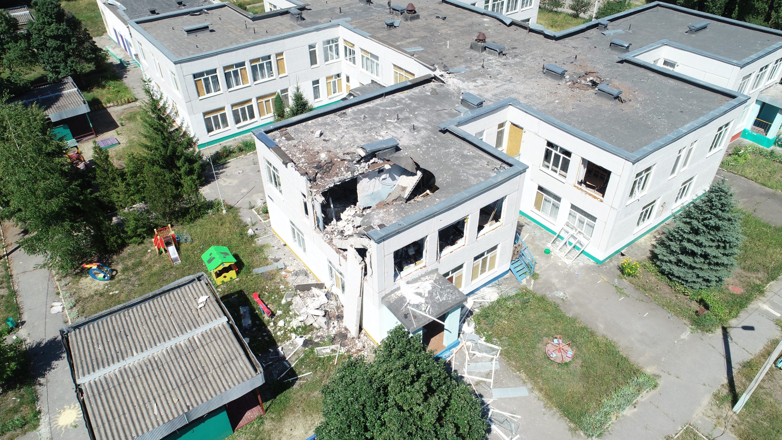 Kharkiv, North Saltivka. Preschool educational institution (nursery-kindergarten) No. 109. As seen from the drone on Jul 9, 2022.