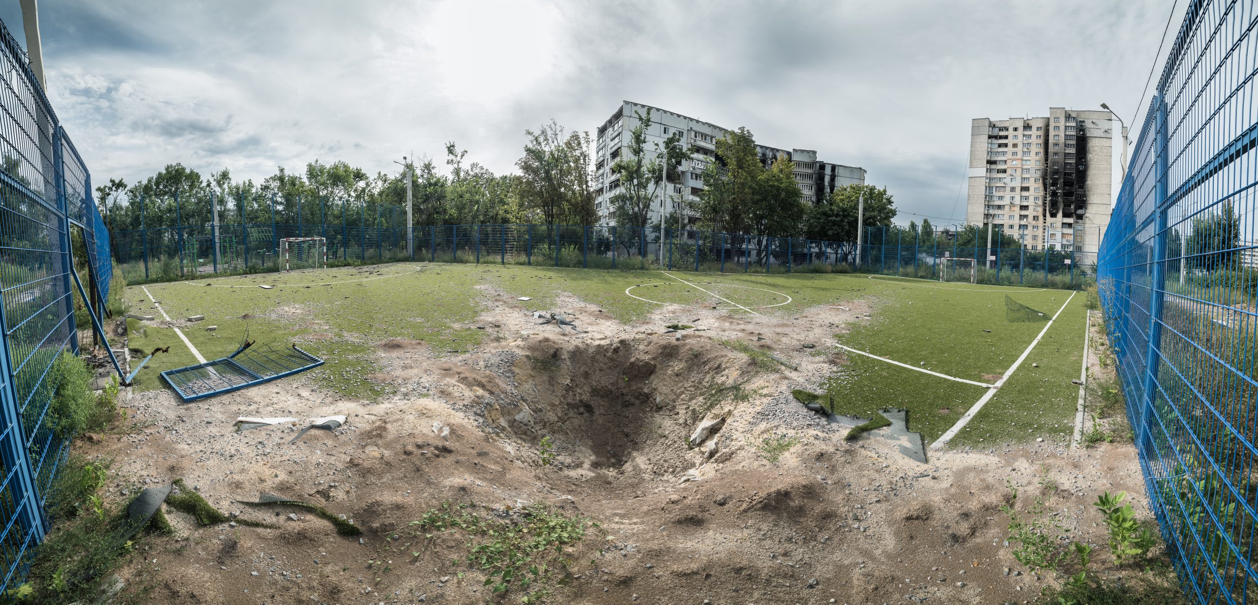 A crater on a football field and damaged apartment buildings in North Saltivka, Kharkiv.