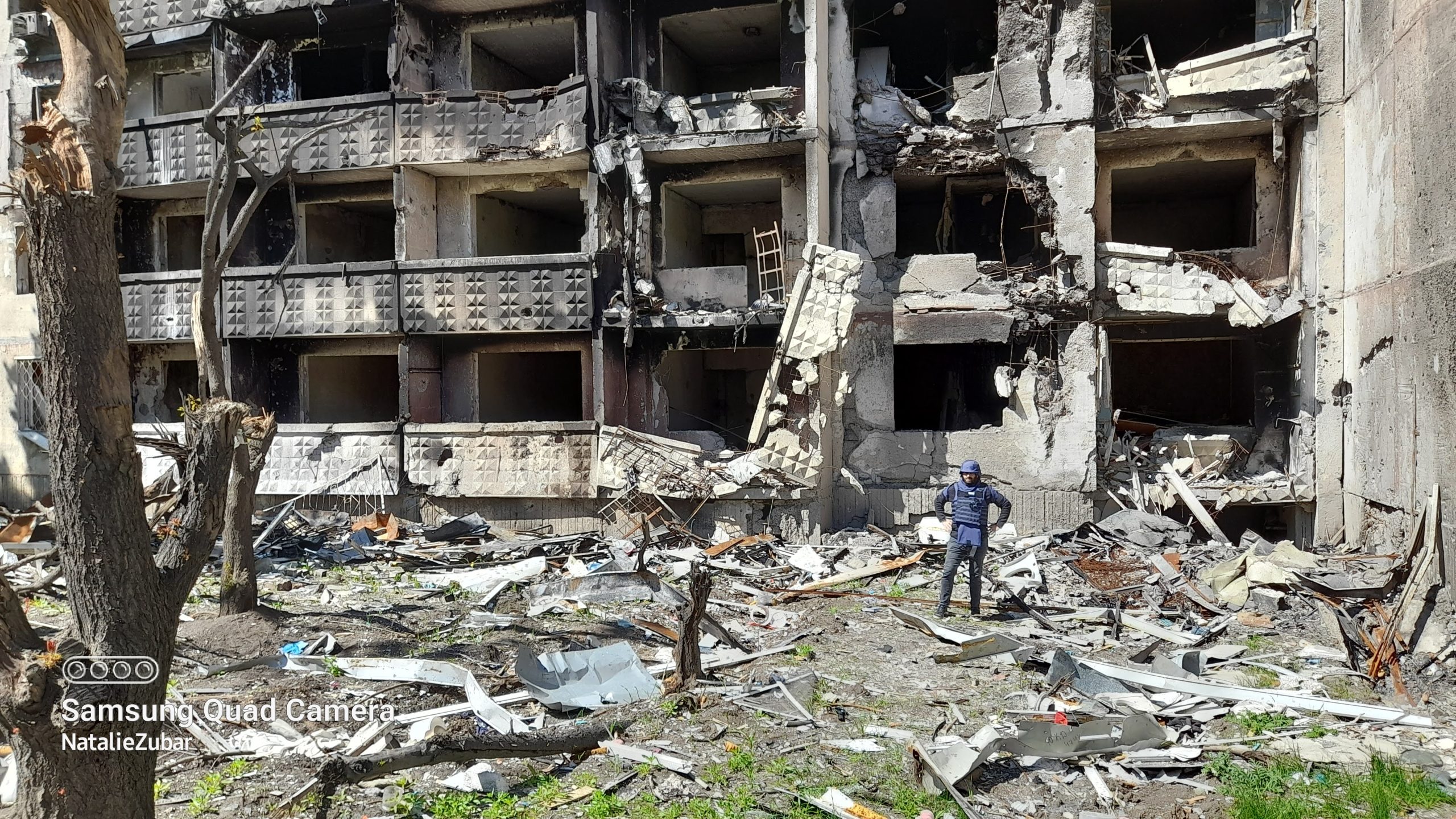 A journalist near the destroyed building in North Saltivka residential district of Kharkiv.