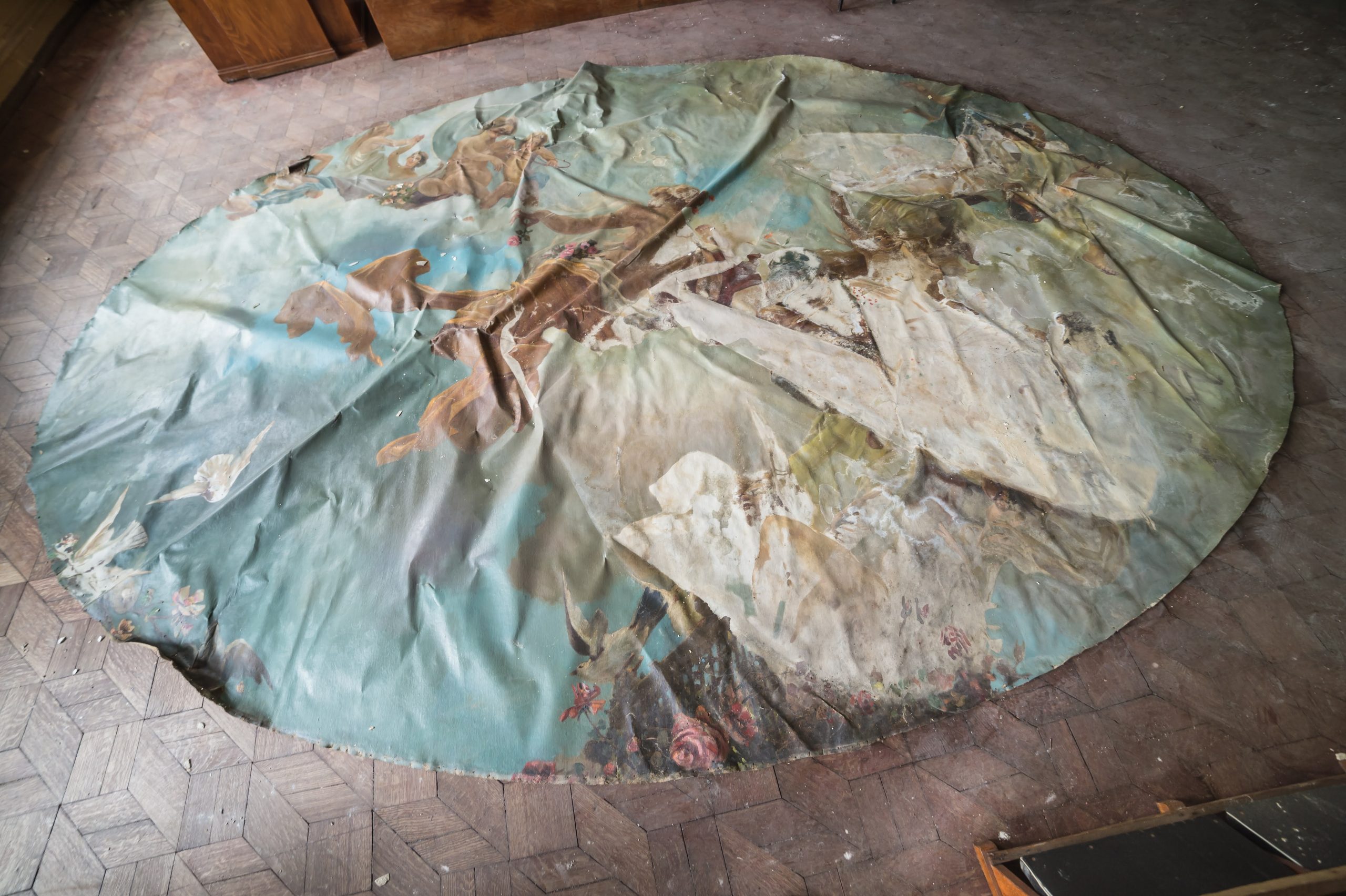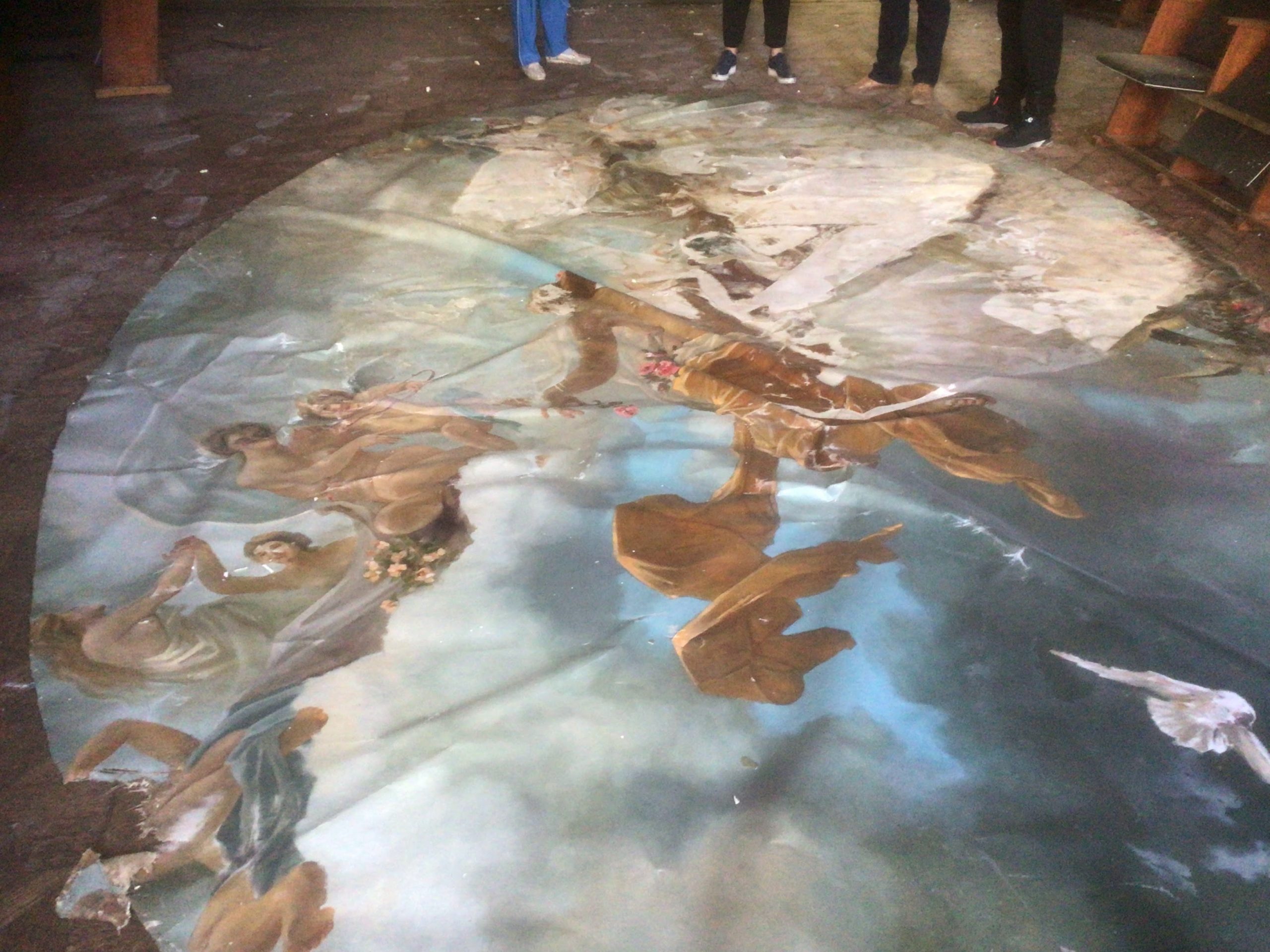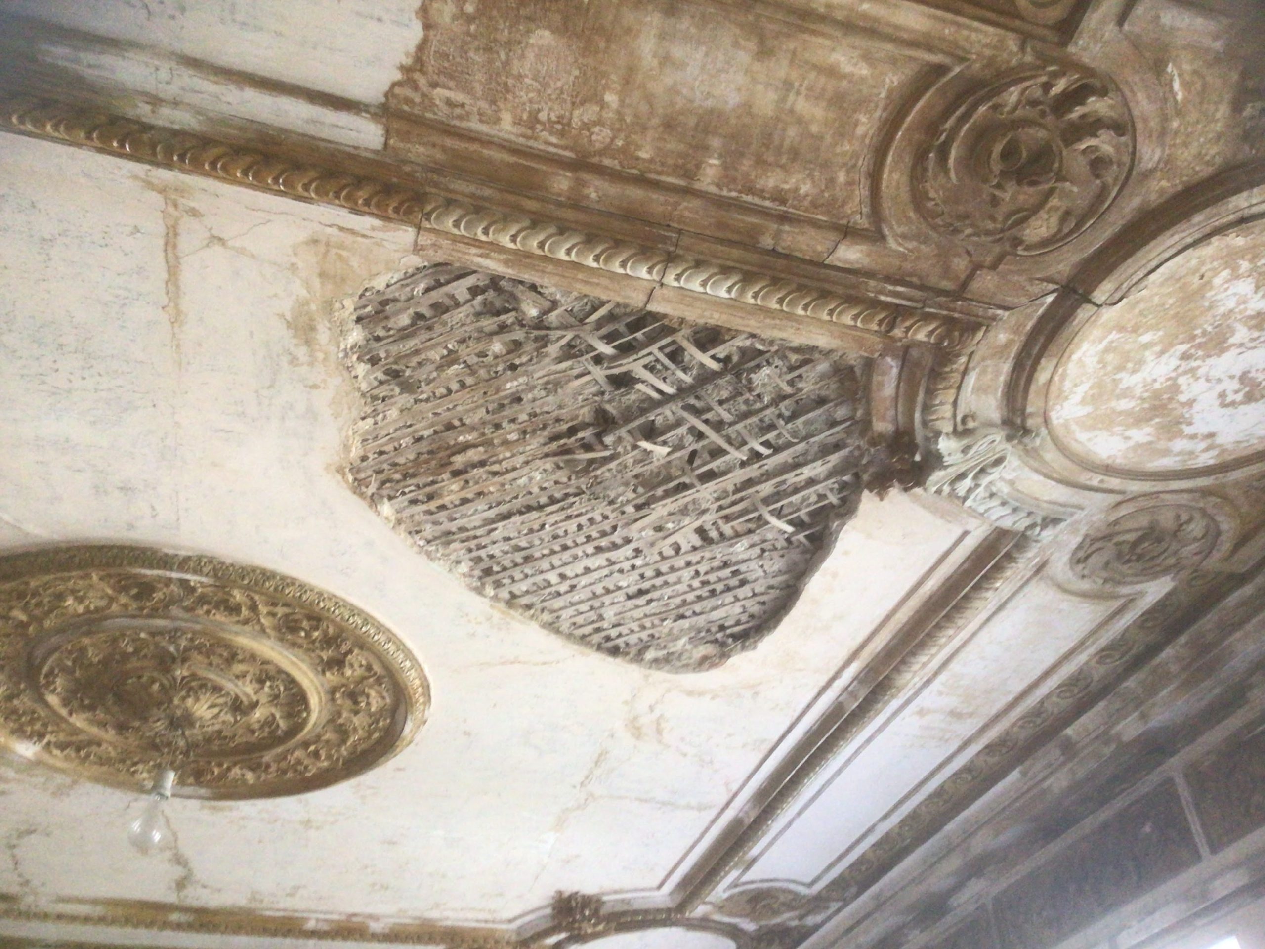 A torn celling decoration in a 19 century historical monument is evaluated by experts.