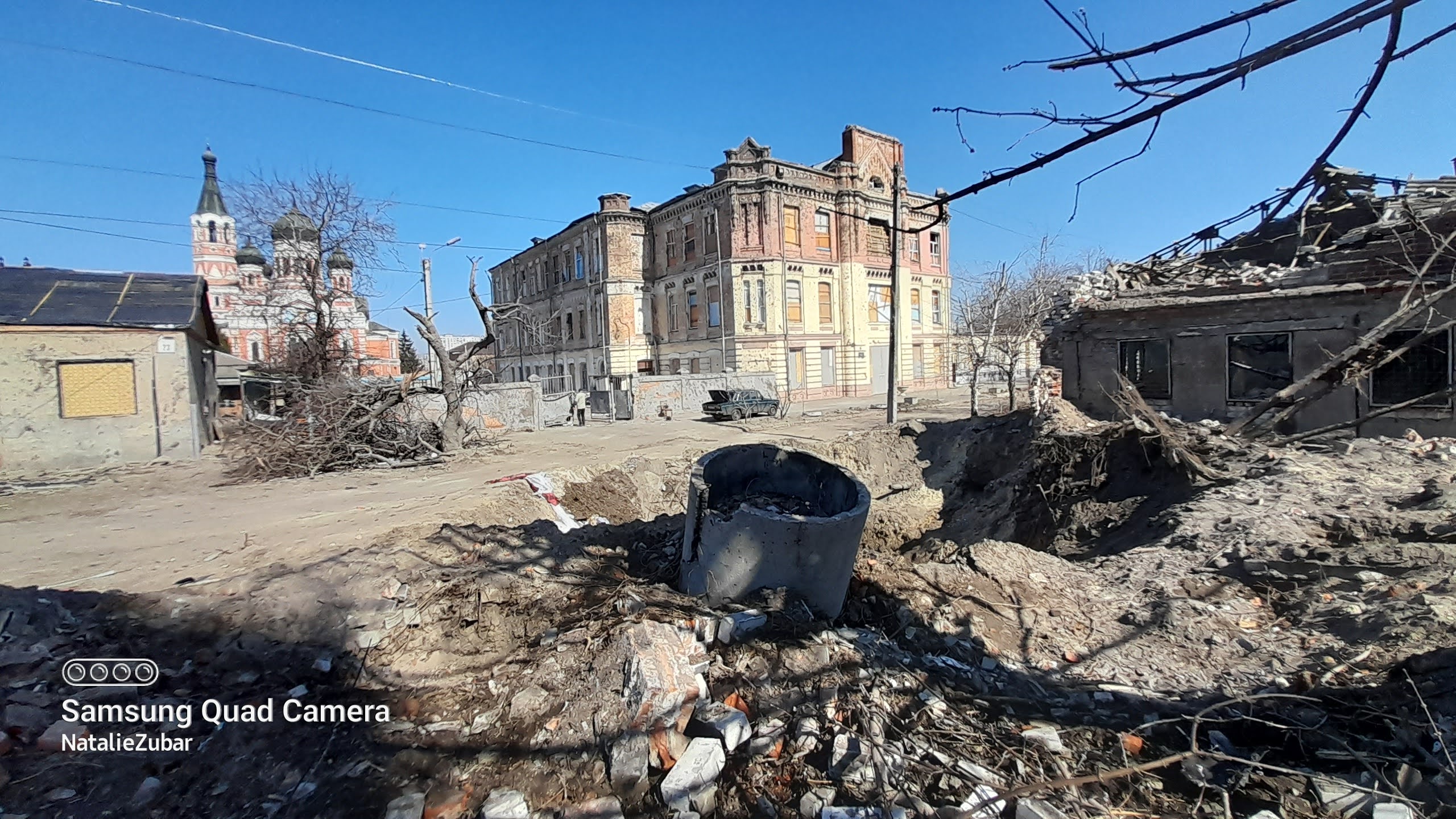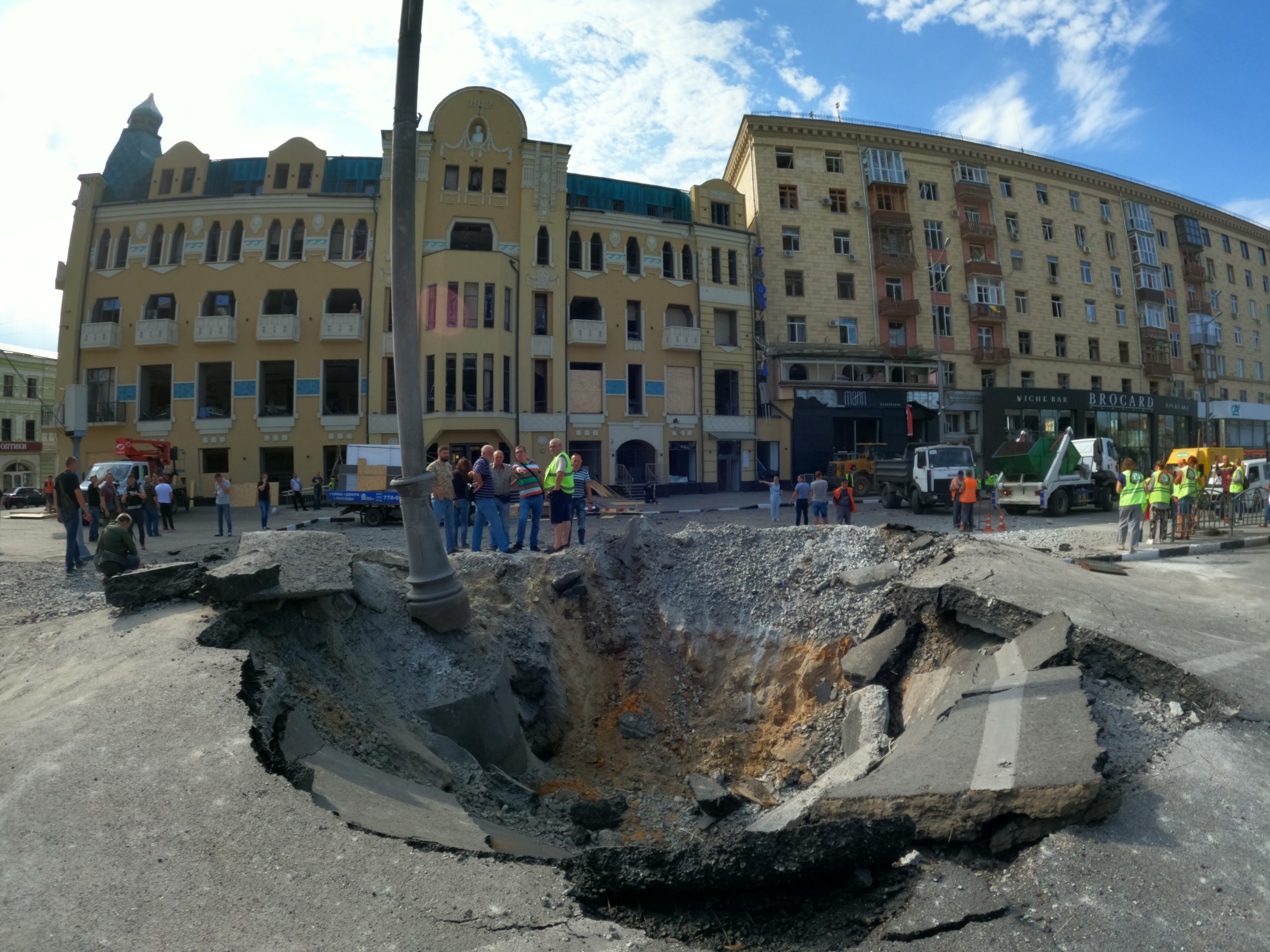 Crater from an S-300 missile, which hit the centre of Kharkiv at ~3:00 AM, August 27, 2022. Photo was taken at 9:35 AM, August 27, 2022 by Yevhen Tytarenko.