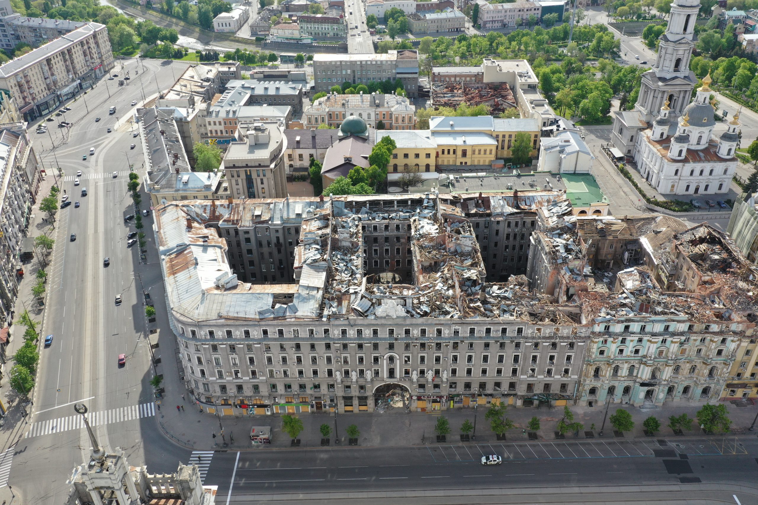 Constitution Square in the historical centre of Kharkiv. The grey office building, known as the Palace of Labour, was commissioned by the “Insurance Company Russia” and finished by 1916. It was hit by the rockets from a flyover Russian bomber on March 2, 2022. As seen from the drone on May 20, 2022.