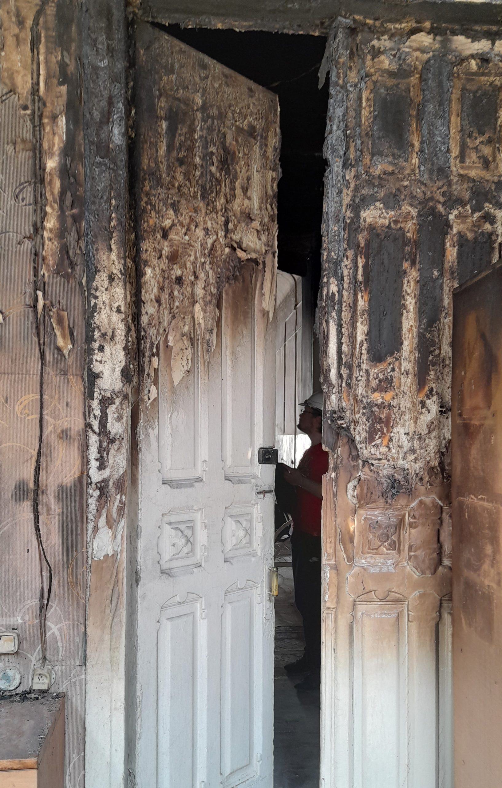 A burnt door in a historical 19 century mansion. A member of a our team Oleksii Svid is behind the door.