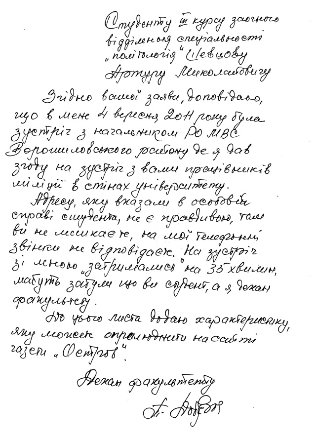Але найцікавіше, виявляється в тому, що декан факультету Петро Добров все таки дозволив проводити допит у стінах університету. Відповідаючи на запит Артура Шевцова декан історичного факультету ДонНу зазначив що: « в мене 4 вересня (вихідний день до речі) 2011 року була зустріч з начальником РО МВС Ворошилівського району, де я дав згоду на зустріч з Вами працівників міліції в стінах університету».