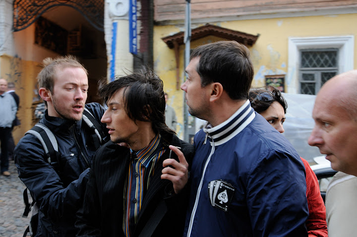 Уже под завершение акции на участников было совершено нападение и нанесение телесных повреждений. После того, как начался дождь, участники накрылись корематами и продолжали акцию стоя. Один из автомобилей, черный BMW X6 АА 3303 НО, совершил наезд на нескольких участников, оттолкнув их корпусом автомобиля, и на большой скорости пронесся по спуску. Через некоторое время автомобиль появился снова, из него вышли четверо – две женщины и двое мужчин. Мужчины, плотного телосложения и высокого роста, напали на первых попавшихся участников, и стали наносить им удары и оскорбления, обвиняя в том, что они нанесли ущерб автомобилю. На упоминания о том, что они совершили наезд на участников, не реагировали, ссылаясь, что везут женщину в клинику. Указанные лица пытались повалить на землю нескольких участников, вмешалась милиция, однако на требования милиции прекратить драку люди из автомобиля не восприняли это, вместо этого вдвоем стали душить и повалили на землю представителя организации «Мистецька платформа» Николая Марусика. Тот не осуществлял сопротивления, и получил телесные повреждения. Милицией был составлен протокол о нарушениях со стороны экипажа автомобиля. Милиция развела в стороны участников, после чего автомобиль скрылся. Милиция заявила, что не смогла задержать участников, и что им удалось скрыться. Участники составили заявления, перечислив в них самых ярых нарушителей за этот день, а также, в отношении нападения на Н. Марусика. Номера машин зафиксированы и переданы в ГАИ.