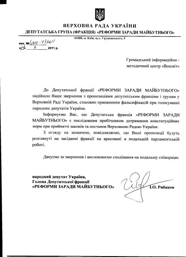 Відповідь голови депутатської групи “Реформи заради майбутнього” І.Рибакова на антипіаністичне звернення – внизу у відсканованому вигляді.