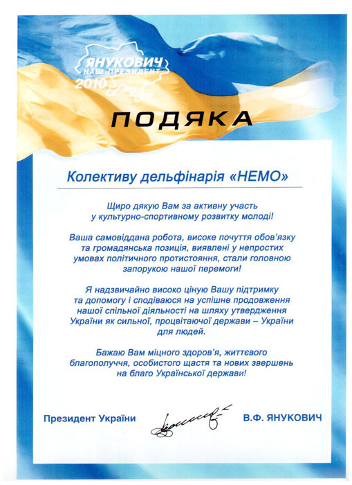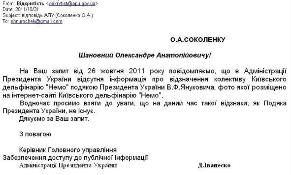 «На Ваш запит від 26 жовтня 2011 року повідомляємо, що в Адміністрації Президента України відсутня інформація про відзначення колективу Київського дельфінарію “Немо” подякою Президента України В.Ф.Януковича, фото якої розміщено на інтернет-сайті Київського дельфінарію “Немо”.Водночас просимо взяти до уваги, що на даний час такої відзнаки, як Подяка Президента України, не існує».