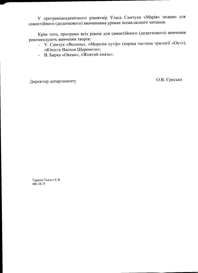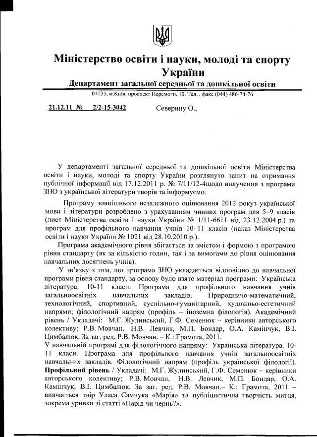 Ми спитали: “чи відповідають дійсности оприлюднені ЗМІ відомости про вилучення з програми ЗНО з української літератури на 2012 рік творів «Марія» Уласа Самчука та «Жовтий князь» Василя Барки. Якщо так, прошу надати інформацію про підстави прийняття такого рішення”.