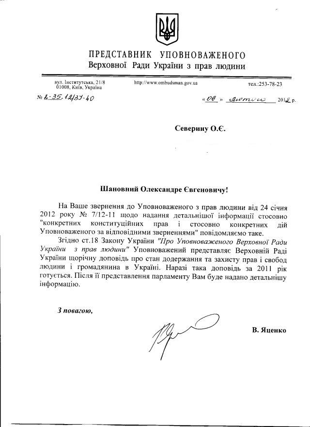 Враховуючи цю прикру обставину, до Ніни Іванівни 30.01.12 прилетів повторний запит, відповідь на який виглядає так: