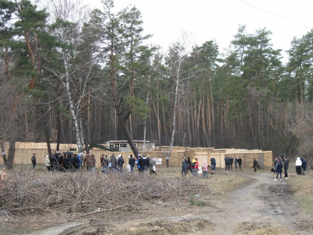 Ділянка Святошинського лісу нижче автостанції “Дачна” і вул. Ушакова, вниз по Житомирській трасі, одразу за озером, вже вдруге обгороджена парканом – вдруге його знесли люди. Вирубано 150 дерев.