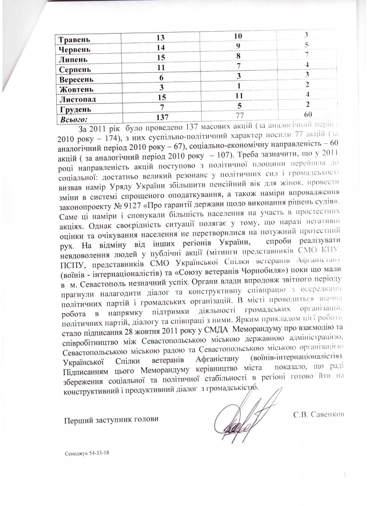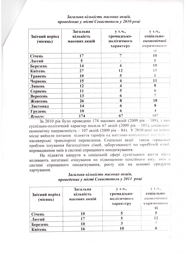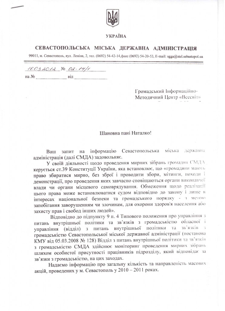 Почнемо в Севастополя, який в таблиці МВС був абсолютним аутсайдером по кількості мирних зібрань. По даним МВС там відбулося в 2010 році 759 мирних зібрань, а по даних Севастопольської міської державної адміністрації – тільки 174. Відповідно в 2011 році – 247 (МВС), 137 (СМДА). Повну відповідь СДМА дивіться внизу (вона цікава і за змістом).