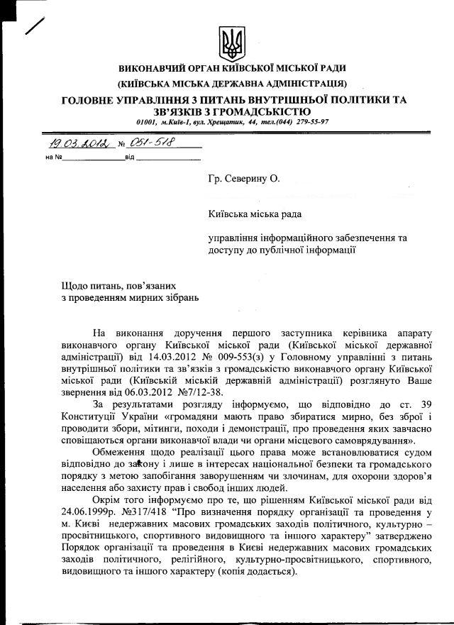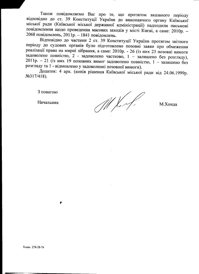 КМДА повідомляє про кількість мирних зібрань (на постсовецькому канцеляриті мові чиновників – “масових заходів”), проведених у столиці у 2010 та 2011 роках і про свою “заборонювальну” активність щодо них.