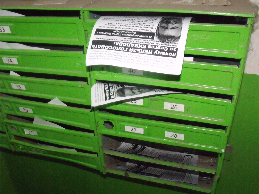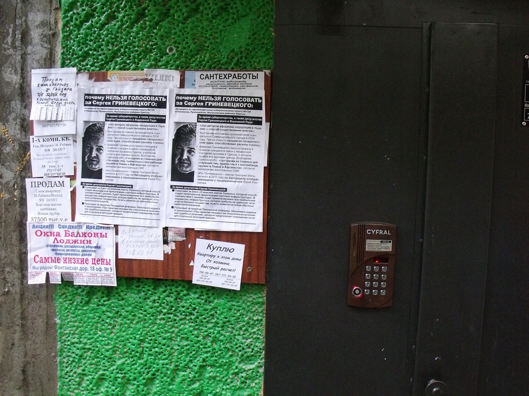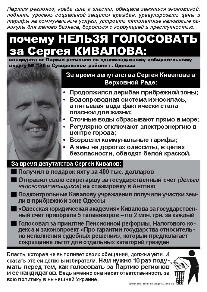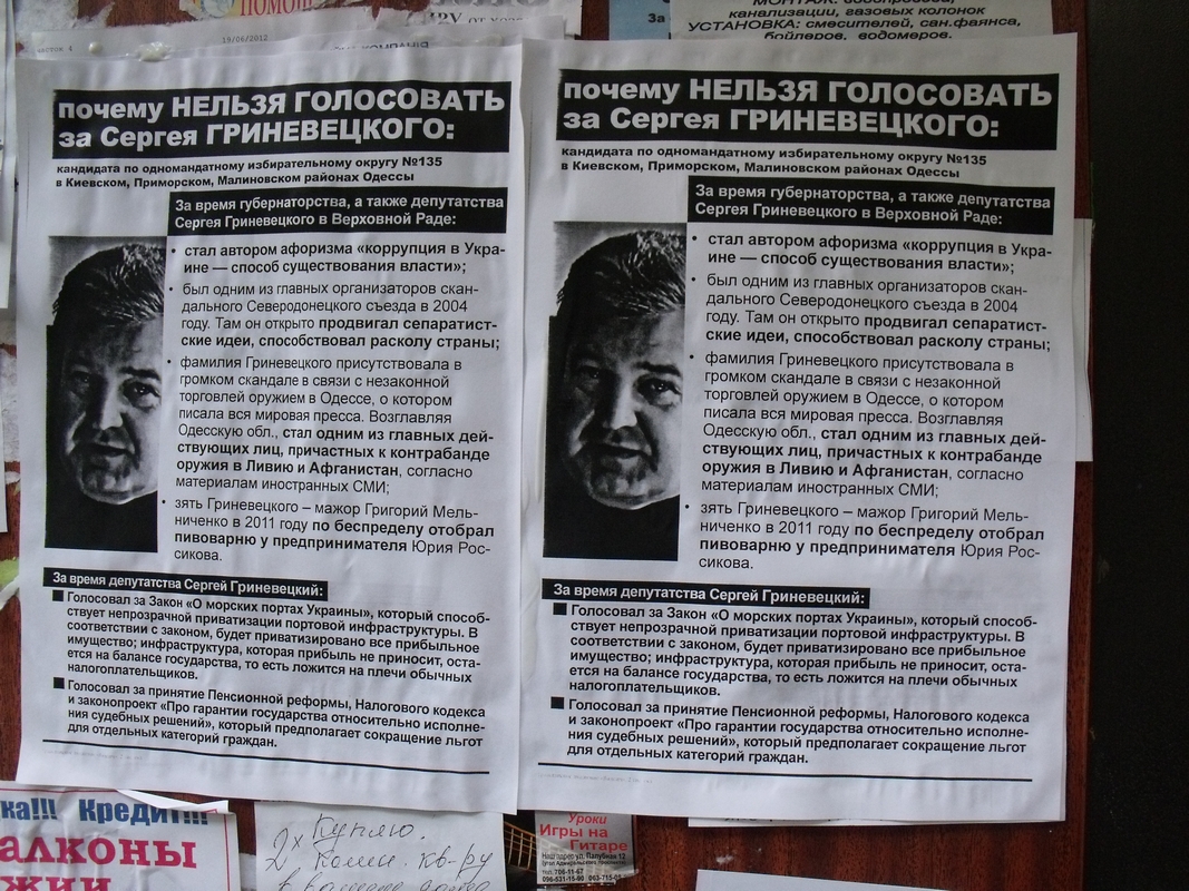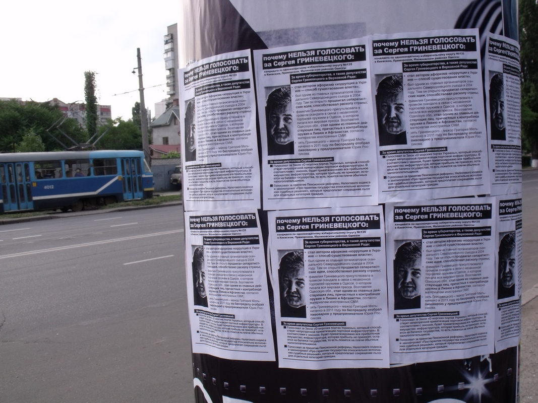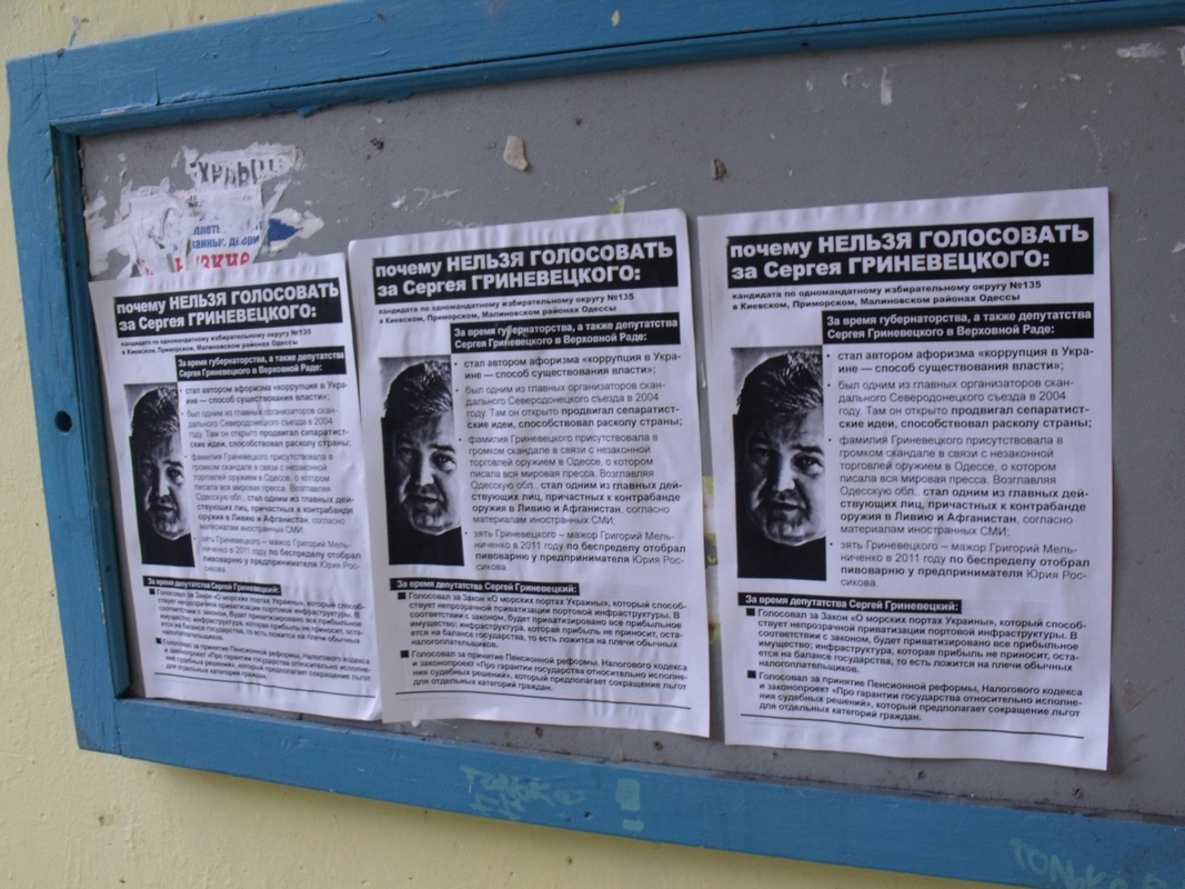 В Одесі збирається балотуватись також інший депутат з числа тих, хто проголосував за законопроект КаКа — Сергій Гриневецький з Народноъ партыъ Литвина. Цей персонаж відомий своїми сеператистськими закликами, незаконною торгівлею зброэю та ін. Листівки з інформацією, чому не варто голосувати за Гриневецького, розповсюдили в Київському та Малиновському районах Одеси.