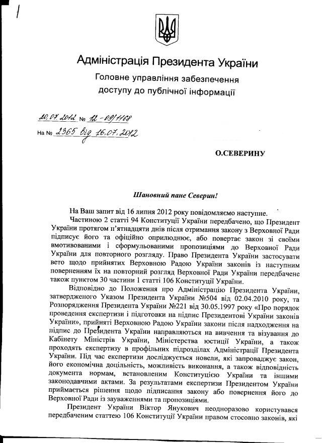 1. Чи застосовував Президент України Віктор Янукович протягом свого перебування на цій посаді право вето до актів Верховної Ради України через порушення при їх розгляді та ухваленні встановленої Конституцією України та Регламентом Верховної Ради України процедури (зокрема – щодо особистого голосування народних депутатів)? Якщо так – то до яких саме?