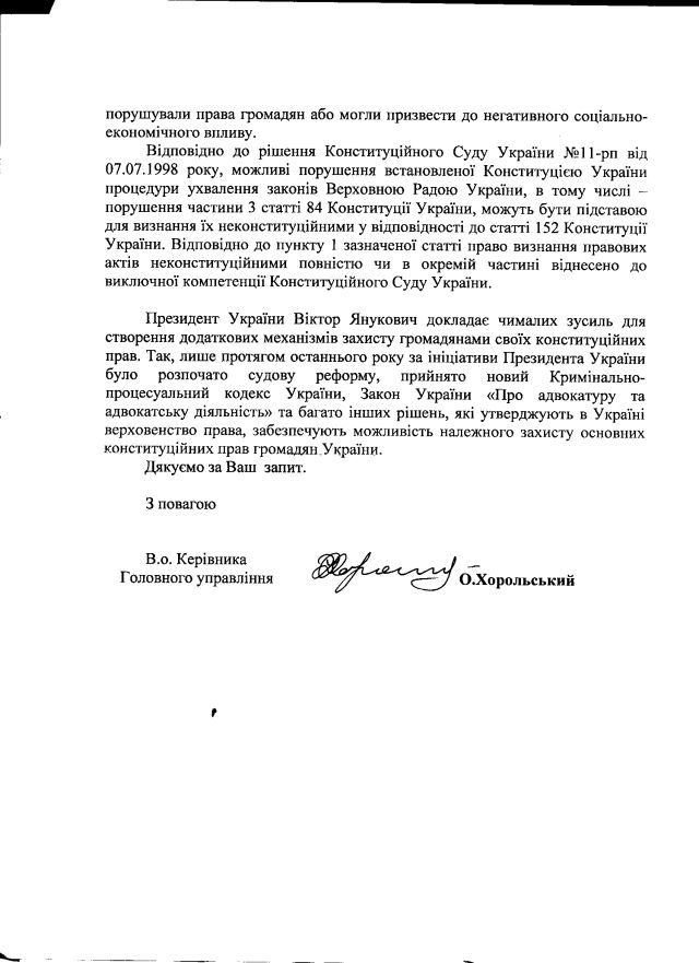 2. Чи вносилися Президентом України Віктором Януковичем протягом його перебування на цій посаді, як суб’єктом законодавчої ініціативи, до Верховної Ради України законопроекти, спрямовані на забезпечення можливости судового оскарження громадянами законів, прийнятих Верховною Радою України з порушенням процедури (в контексті норми ст.3 Конституції України “держава відповідає перед людиною за свою діяльність” та частини другої ст.55 Конституції України)?