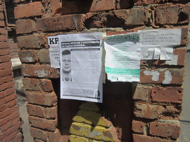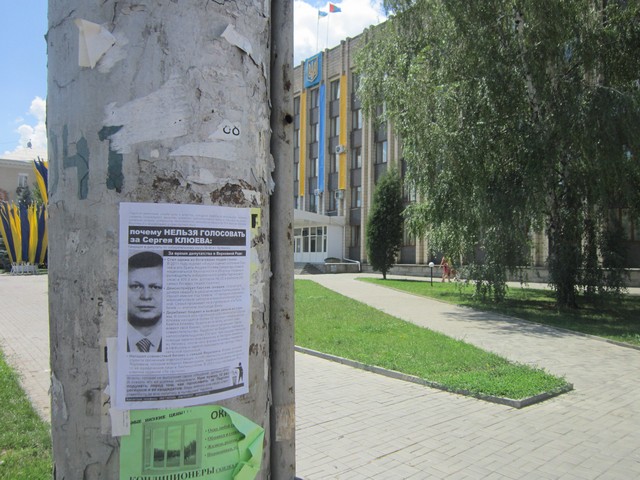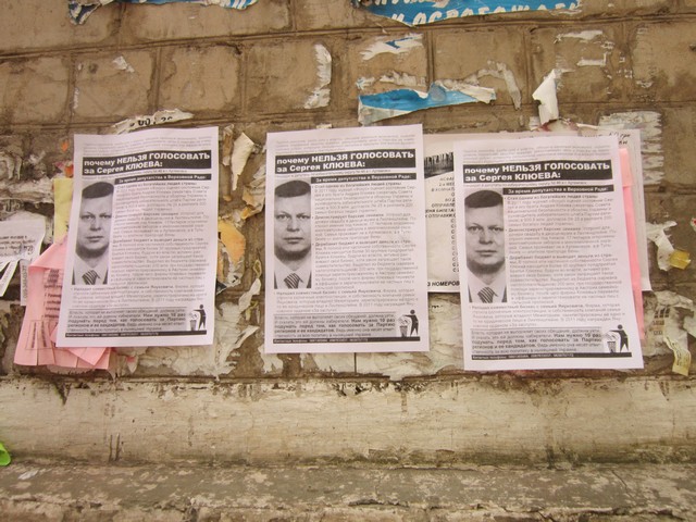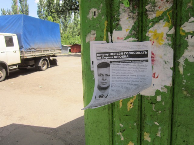 Мешканців міста Артемівська Донецької області активісти кампанії “Помста за розкол країни” закликали не голосувати за Сергія Клюєва, брата одного з головних тіньових лобістів законопроекту Колесніченка-Ківалова “Про засади державної мовної політики” голови Ради нацональної безпеки і оборони України та керівника виборчого штабу Партії регіонів Андрія Клюєва.