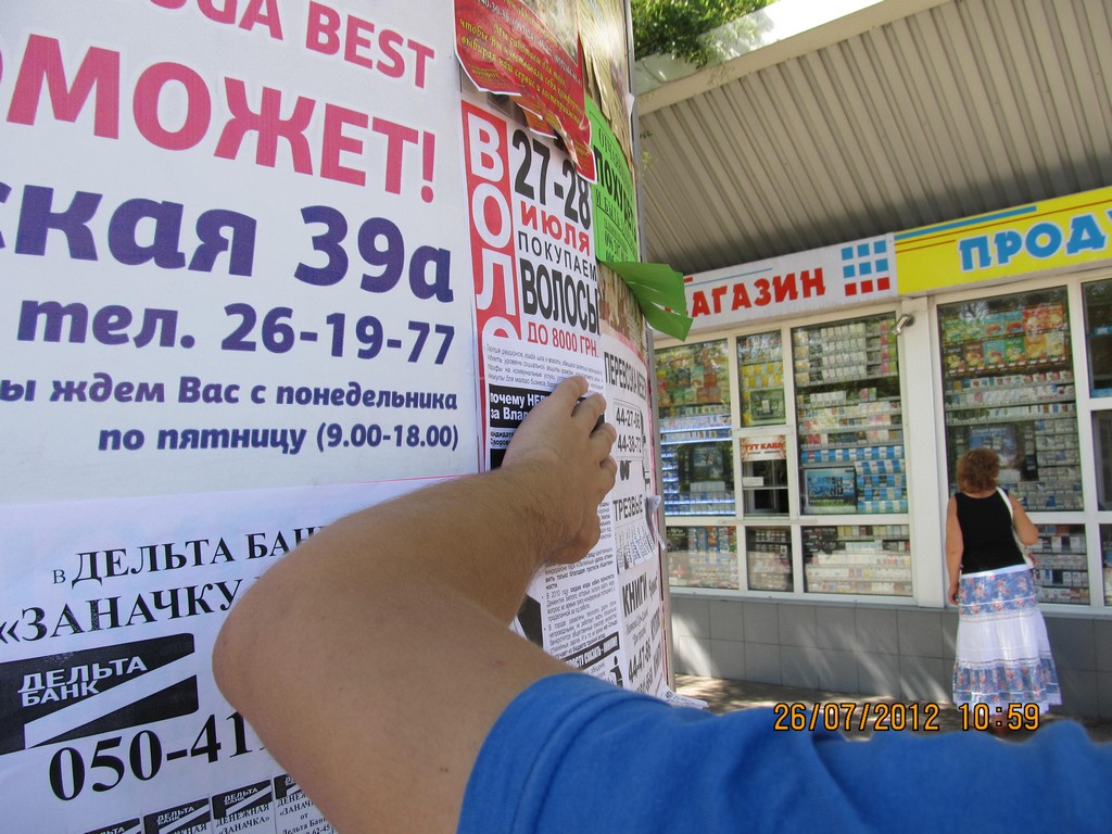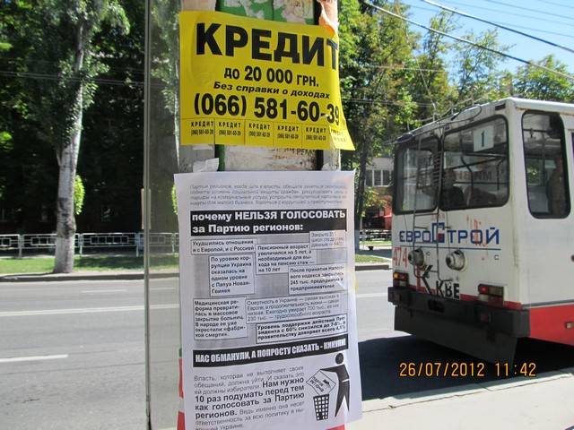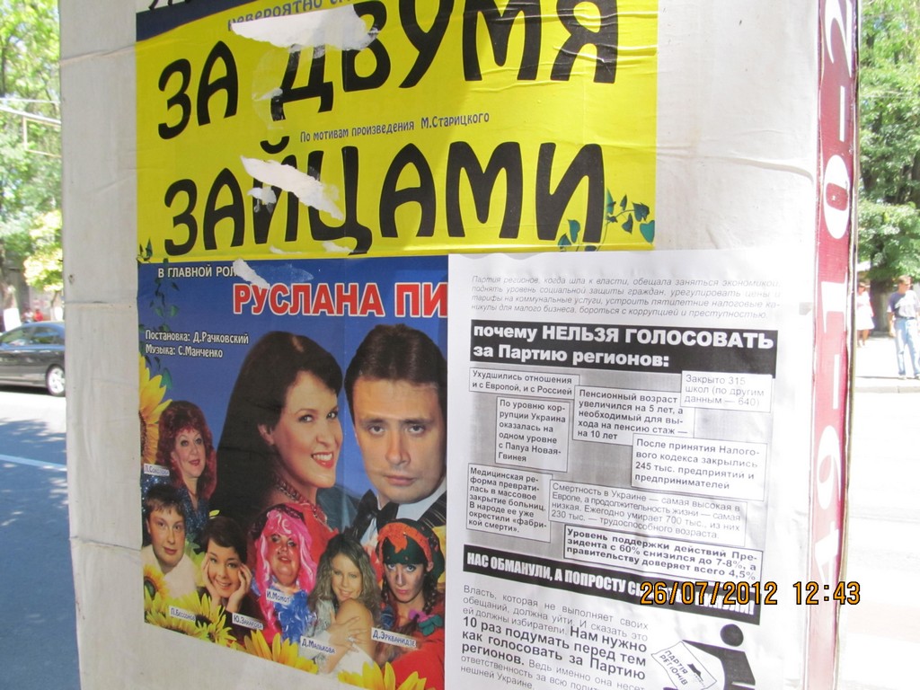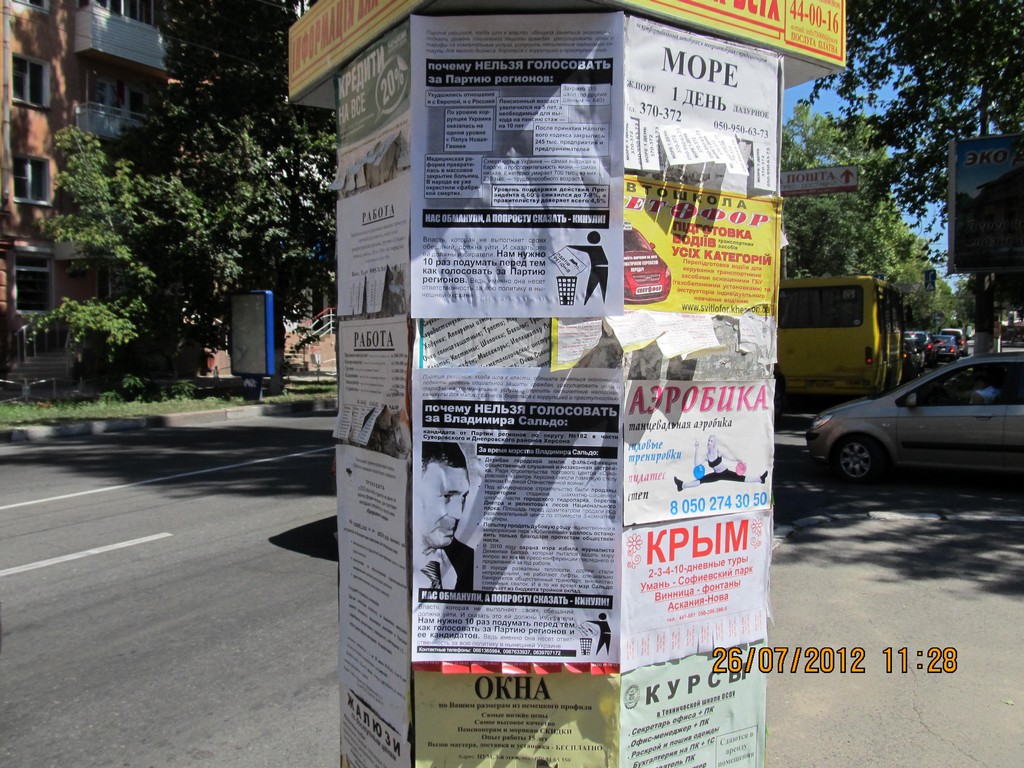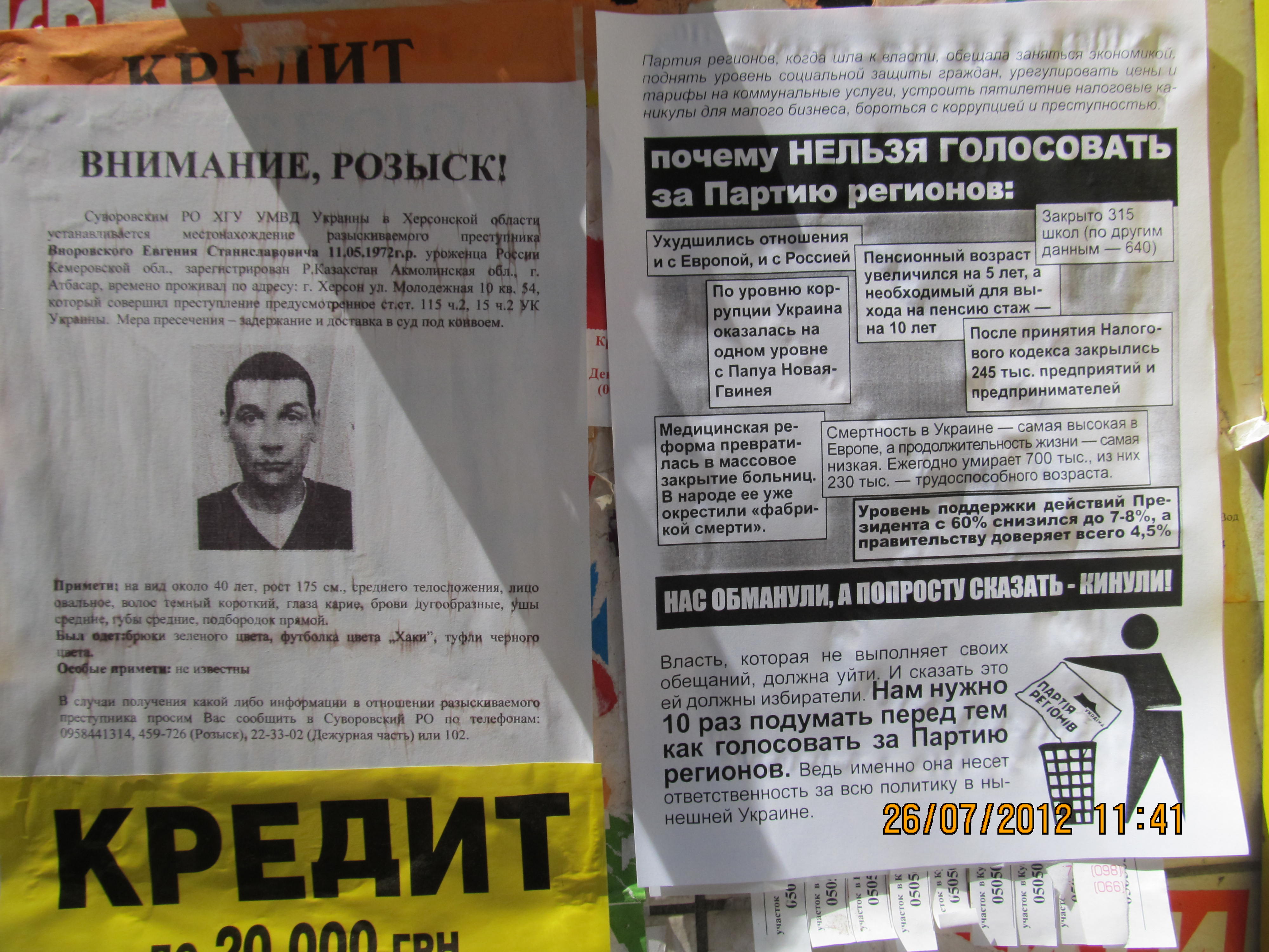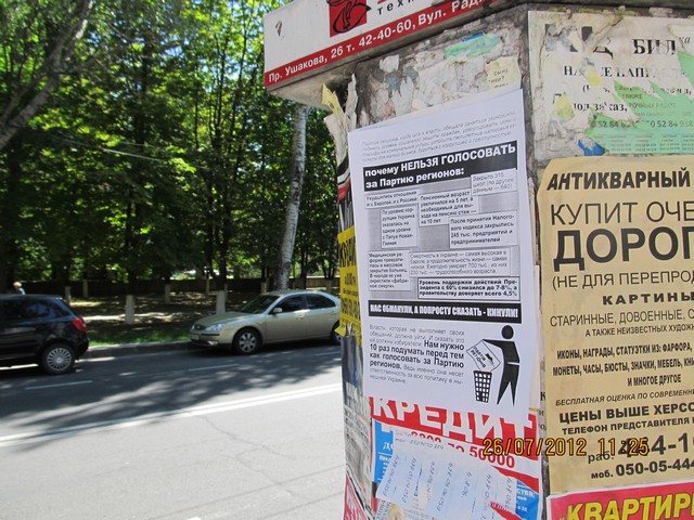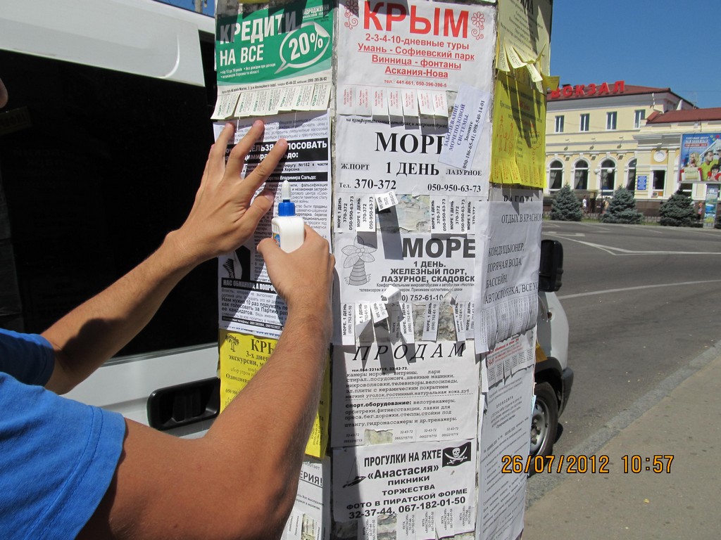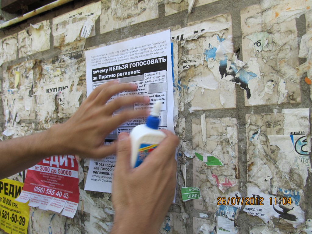 Кампания “Месть за раскол страны” охватывает все большее число регионов Украины. Сегодня, 26 июля, активисты кампании провели расклейку и раздачу листовок с призывом не голосовать за Партию регионов в Херсоне. Также, как и в других городах, жителей Херсона проинформировали о последствиях правления Партии регионов – ухудшении уровня благосостояния украинцев, низких экономических показателях страны, сокращении социальных выплат, то есть об отсутствии обещанного властью улучшения жизни и призвали избирателей не забывать о том, что Партия регионов несет за это прямую ответственность и, соответственно, не голосовать за эту политическую силу на парламентских выборах-2012.