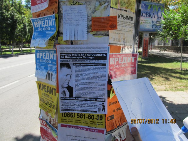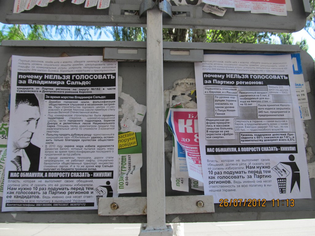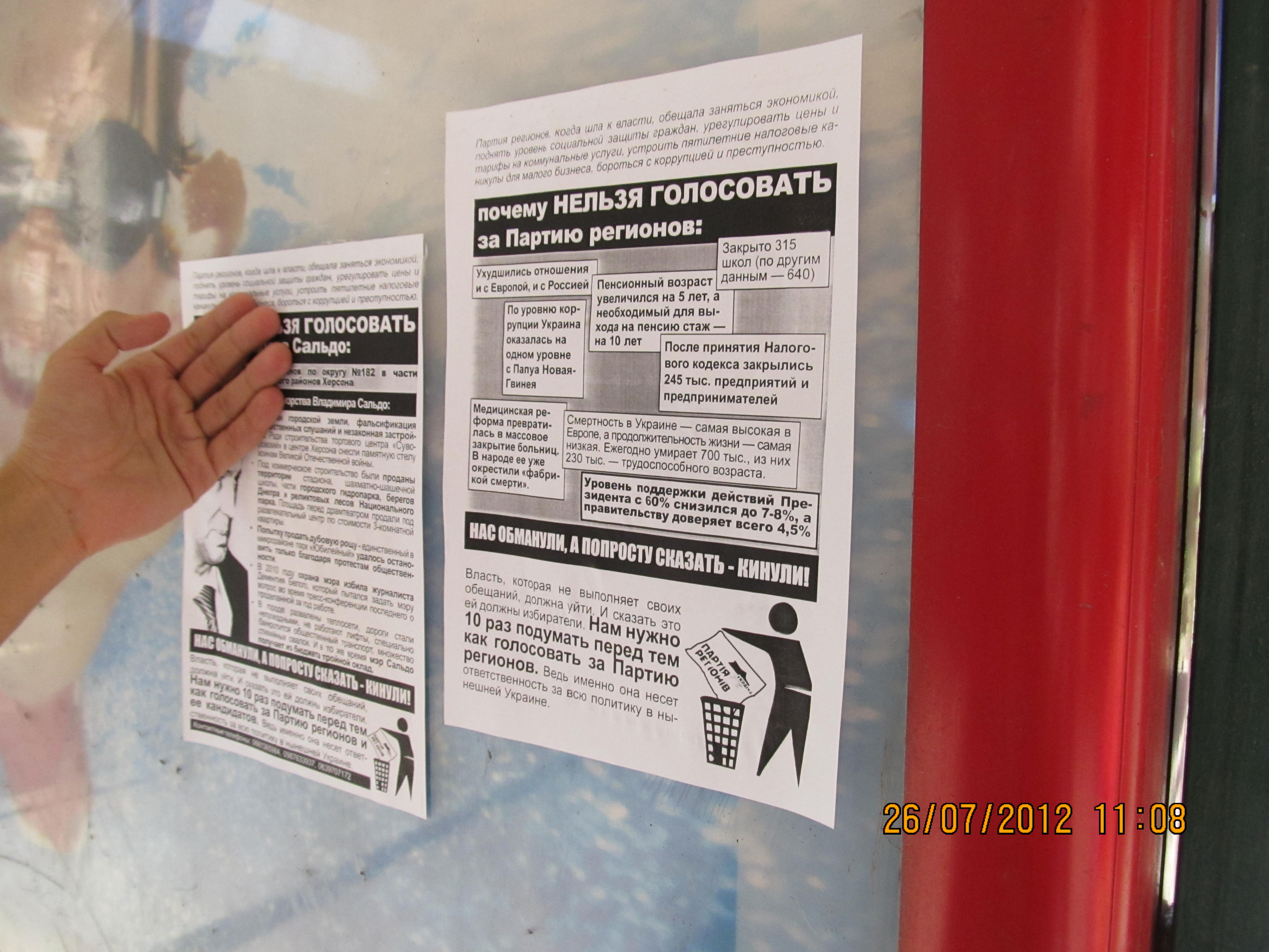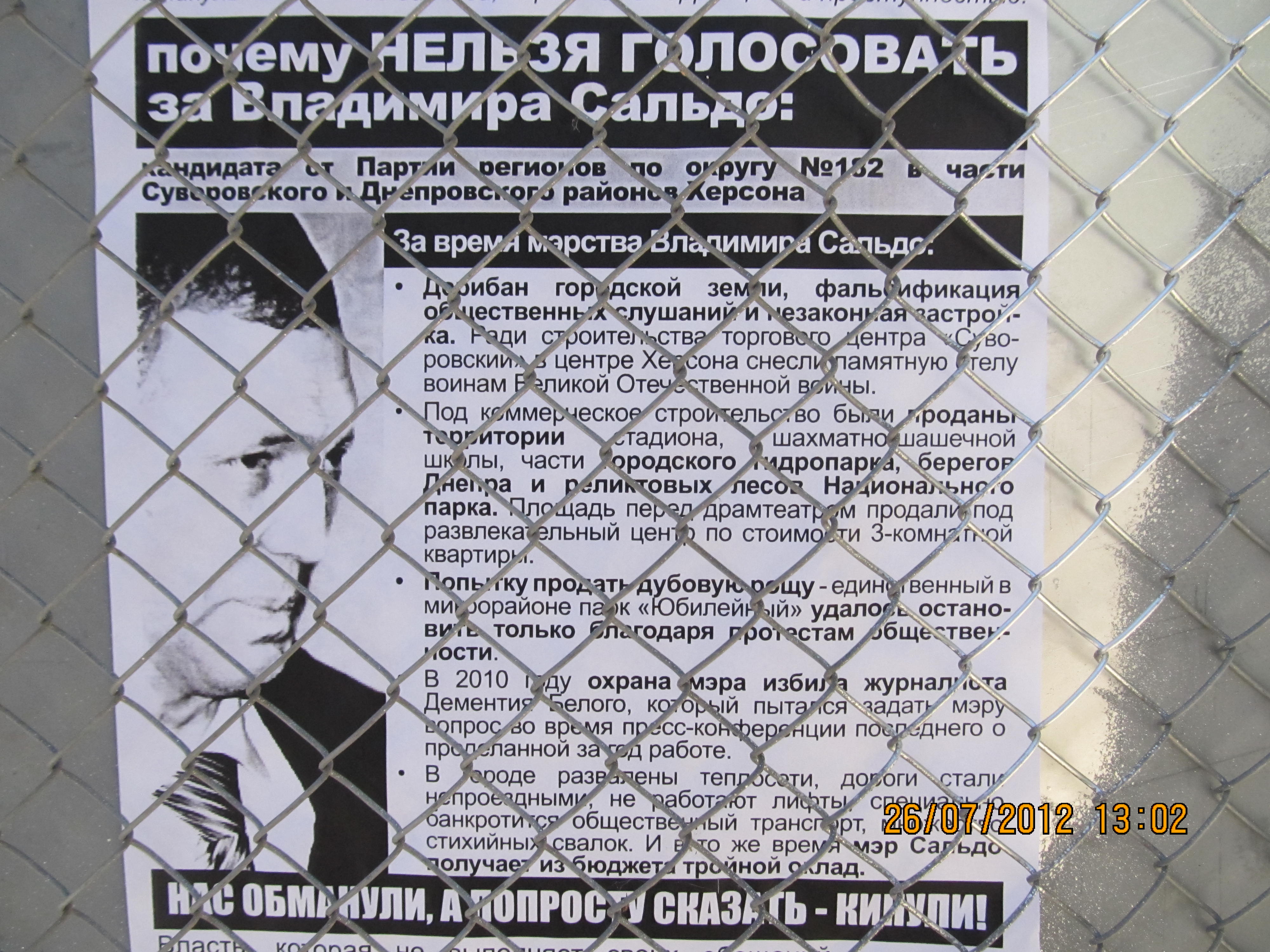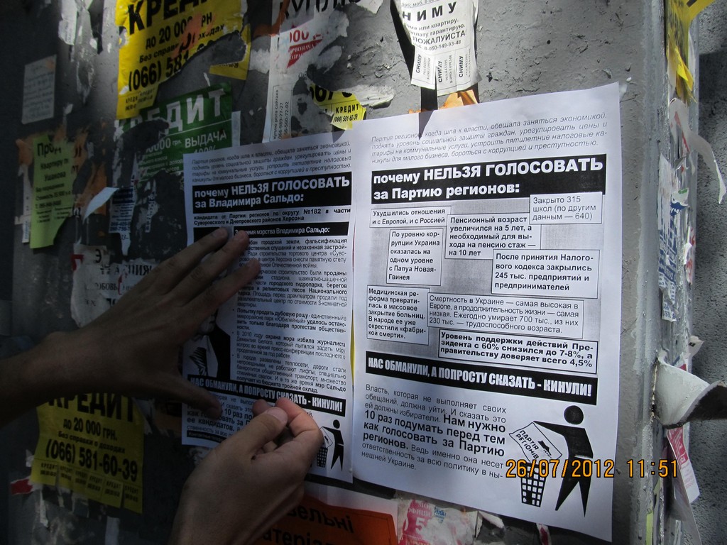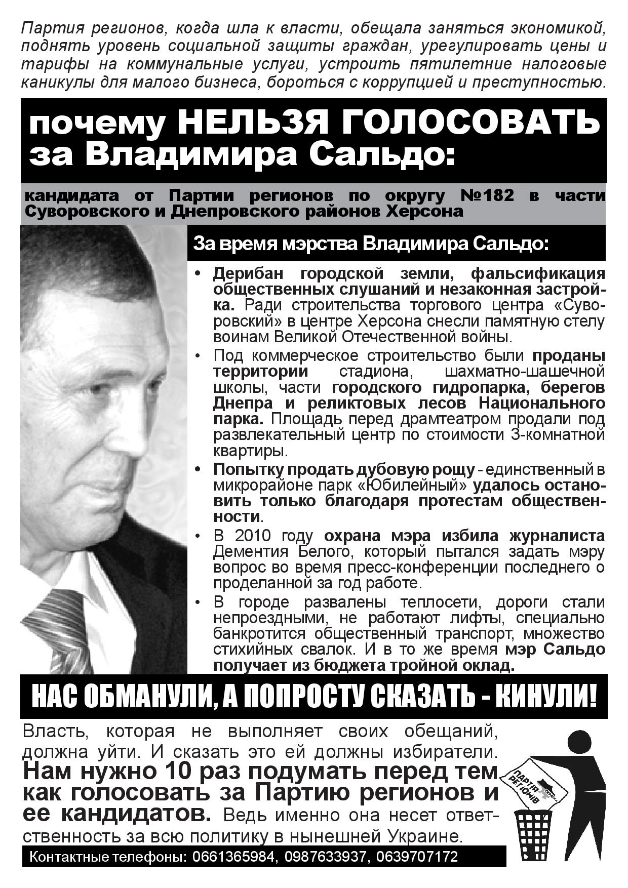 Также в одномандатном избирательном округе №182 – части Суворовского и Днепровского районов Херсона – были расклеены и розданы листовки с разъяснением, почему нельзя голосовать за Владимира Сальдо – безсменного на протяжении многих лет мэра Херсона и выдвиженца в народные депутаты от Партии регионов на парламентских выборах. Мэра уличили в совершении коррупуционных действий, дерибане городской земли, фальсификации общественных слушаний и способствованию незаконной застройке в Херсоне.