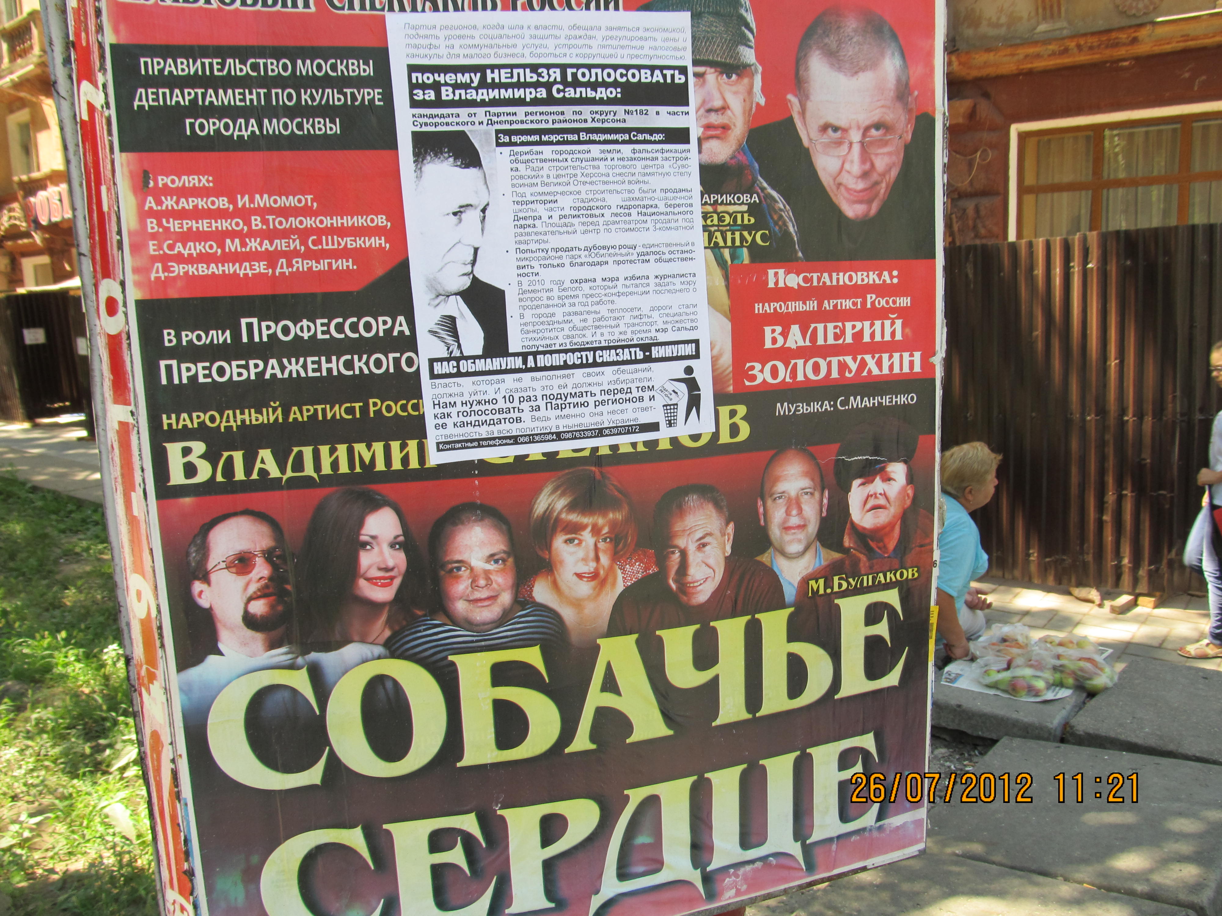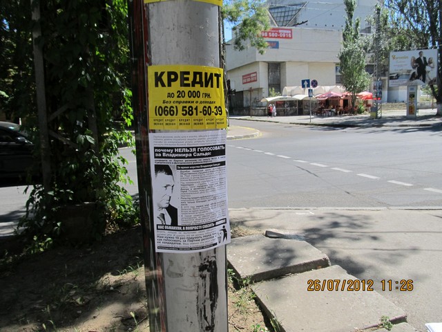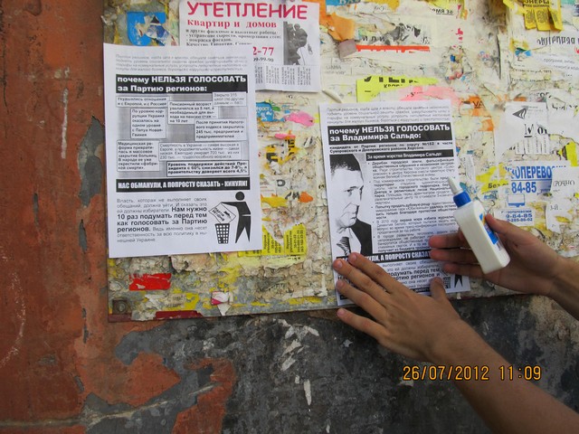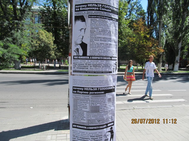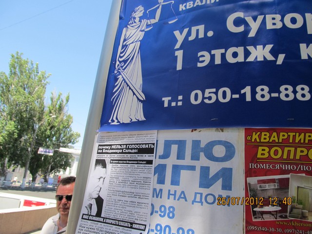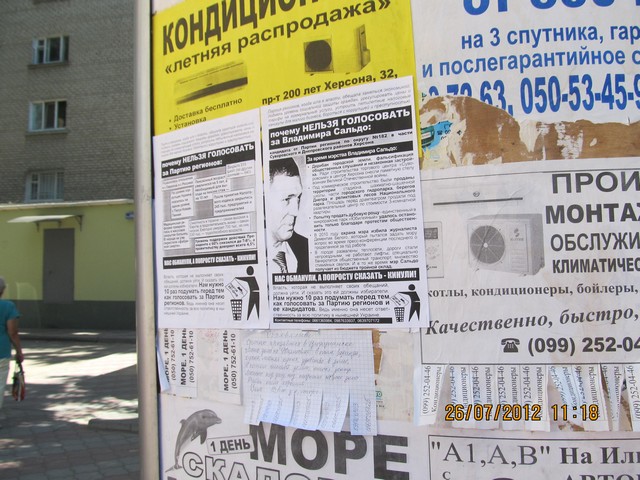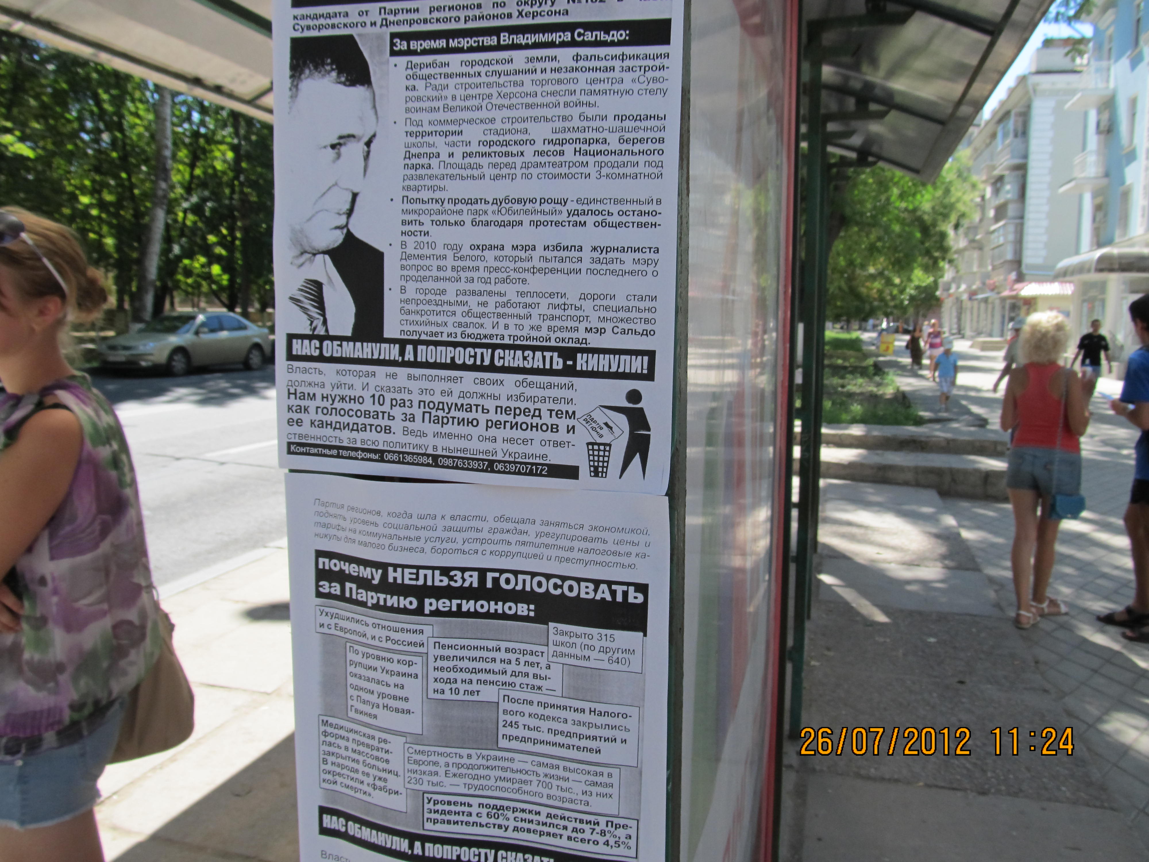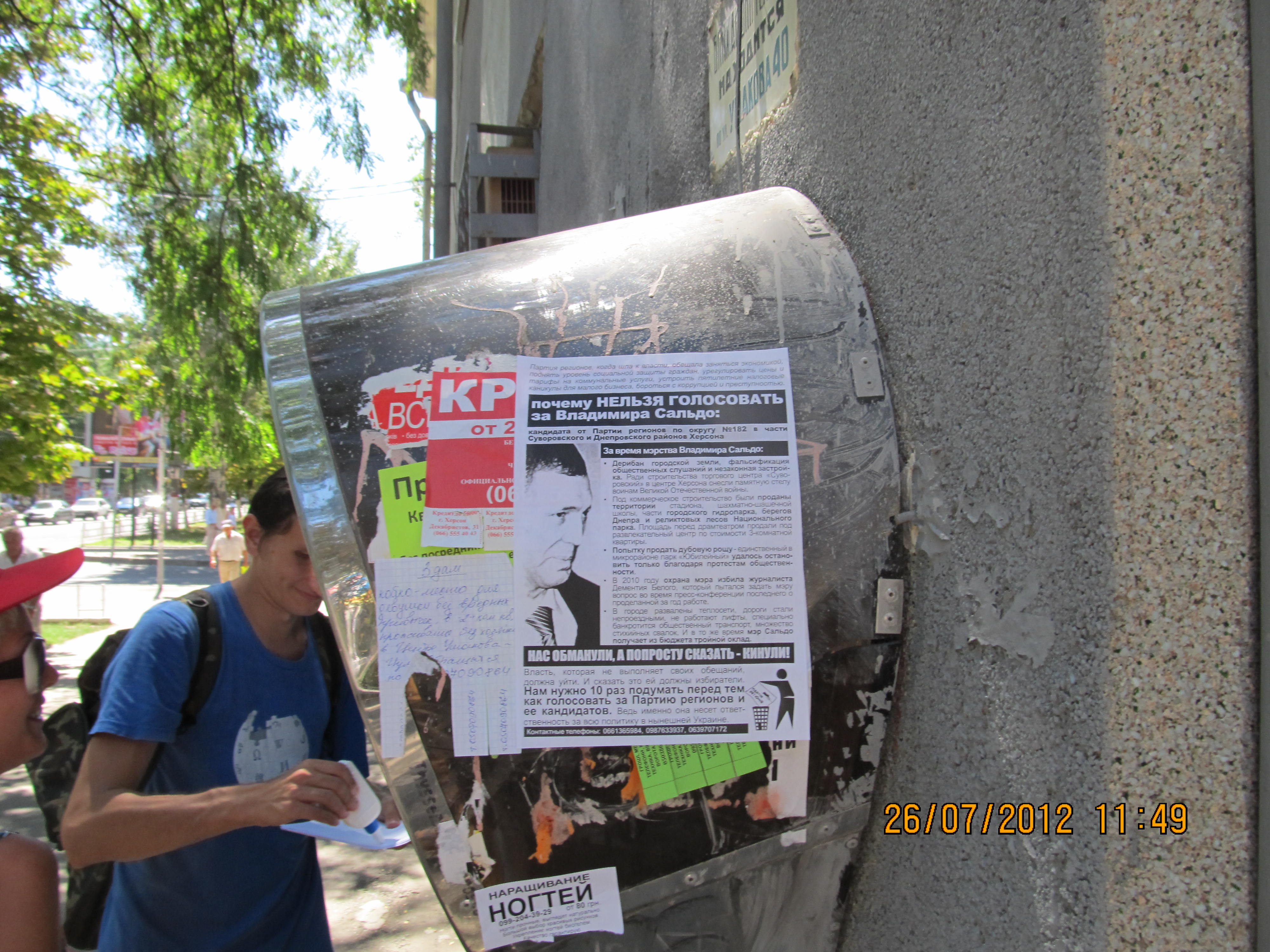 Также в одномандатном избирательном округе №182 – части Суворовского и Днепровского районов Херсона – были расклеены и розданы листовки с разъяснением, почему нельзя голосовать за Владимира Сальдо – безсменного на протяжении многих лет мэра Херсона и выдвиженца в народные депутаты от Партии регионов на парламентских выборах. Мэра уличили в совершении коррупуционных действий, дерибане городской земли, фальсификации общественных слушаний и способствованию незаконной застройке в Херсоне.