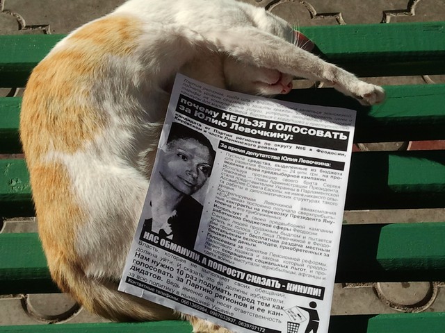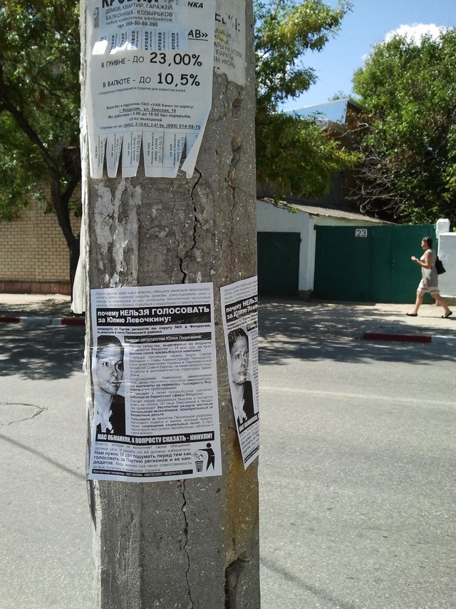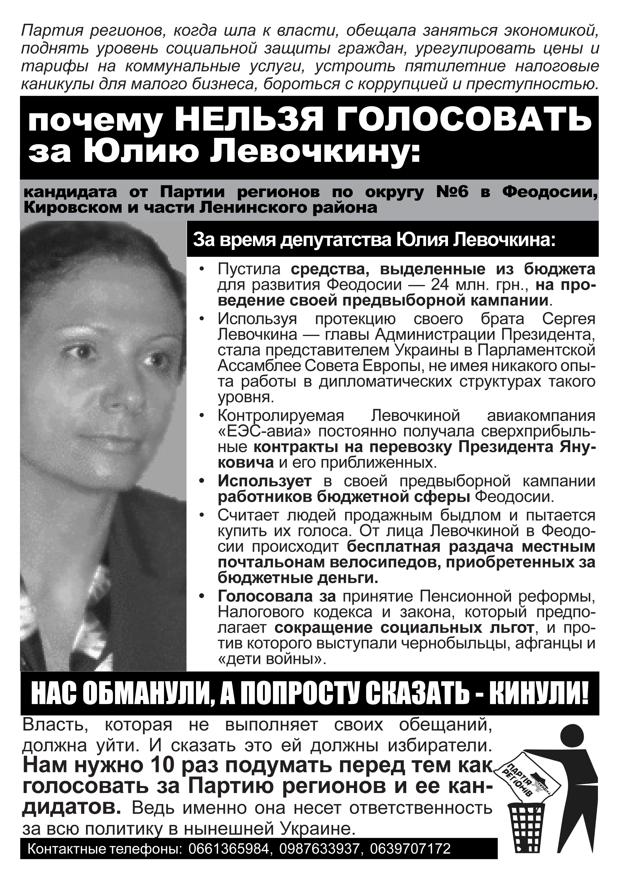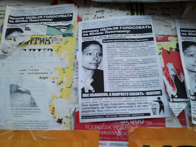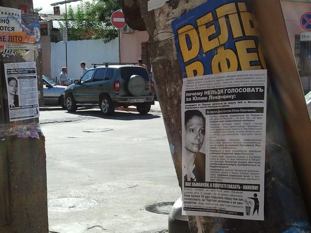 Позвонив по указанным на листовке телефонам, наш крымский корреспондент получил ответ, что распространителями листовок являются активисты кампании “Месть за раскол страны”, и что эти телефоны есть и на других листовках, размещенных на сайте кампании. Там же есть и листовка против Юлии Левочкиной. Отсутствие требуемых Законом “О выборах народных депутатов Украины” выходных данных активисты кампании объяснили тем, что листовки печатались и распространялись еще до регистрации Ю. Левочкиной кандидатом в народные депутаты, т.е. до начала ее избирательной кампании, и что ее распространяли приехавшие в Крым агитаторы вместе с местными волонтерами кампании, а сейчас все листовки кампании такие данные имеют. Тот факт, что в Феодосии продолжают распространяться листовки без выходных данных о тираже и и учреждении, которое отпечатало их, активисты объяснили народной инициативой: многие жители города из числа противников Партии регионов помогали распространять волонтерам листовки и обещали своими силами изготовлять некоторое их количество и продолжать расклейку.