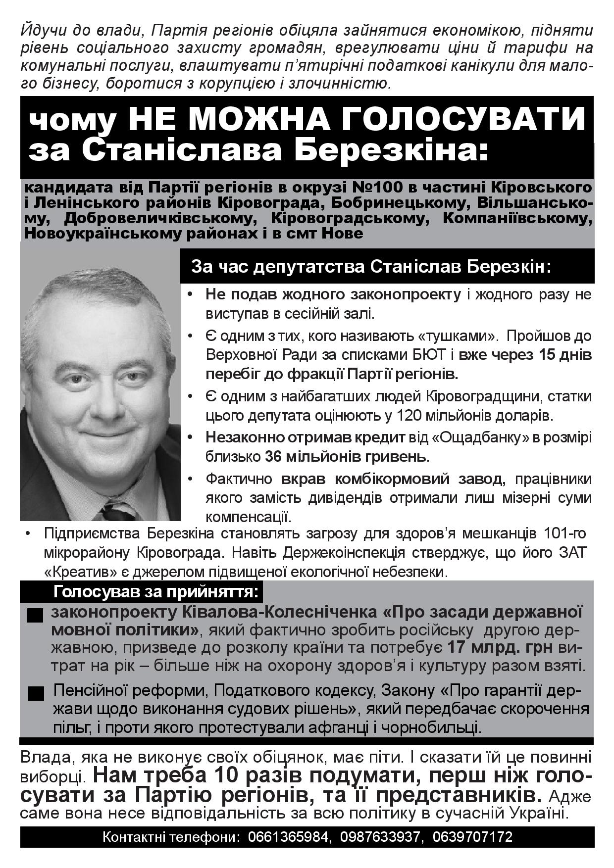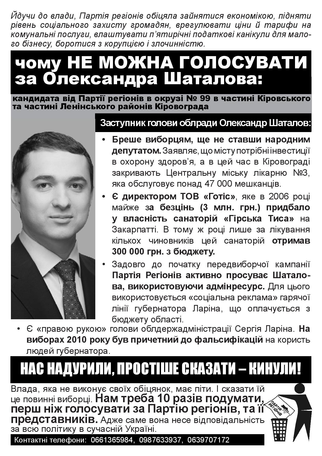 роз’ясненням, чому не можна голосувати за Партію регіонів, а також за її кандидатів в одномандатних мажоритарних округах – чинного нардепа Станіслава Березкіна і молодого регіонала, “праву руку” голови облдержадміністрації Олександра Шаталова.