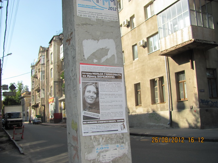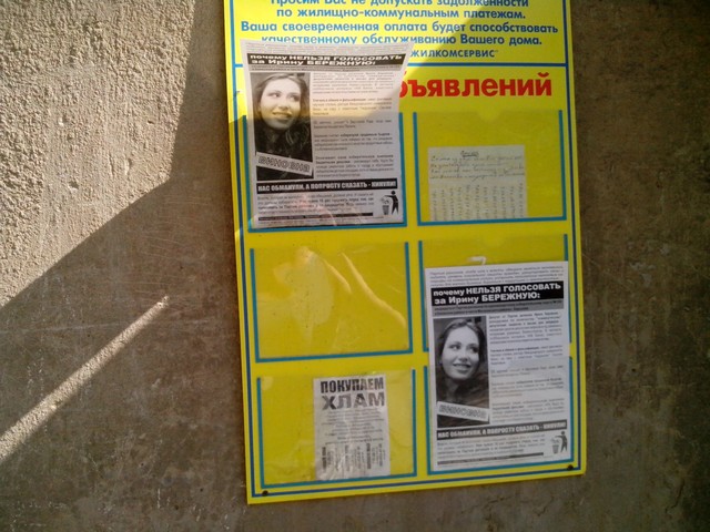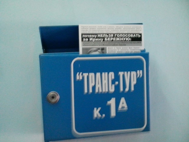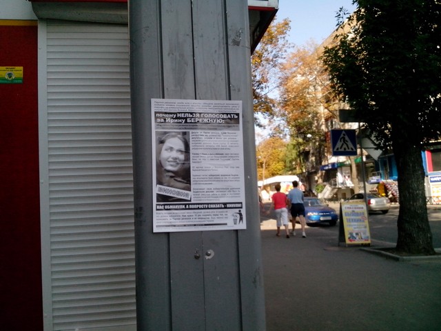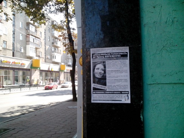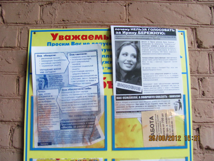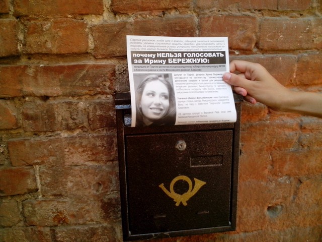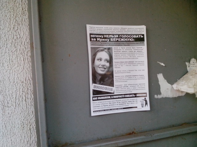 В Харкові продовжується “помста за розкол країни” Партії регіонів та її кандидатам в одномандатних мажоритарних округах. Активісти кампанії вже поширювали в місті інформаційні листівки з закликом не голосувати за кандидата від Партії регіонів в окрузі № 168 – чинного народного депутата Валерія Писаренка. Наступними об’єктам “помсти” стала народ депутат Ірина Бережна.