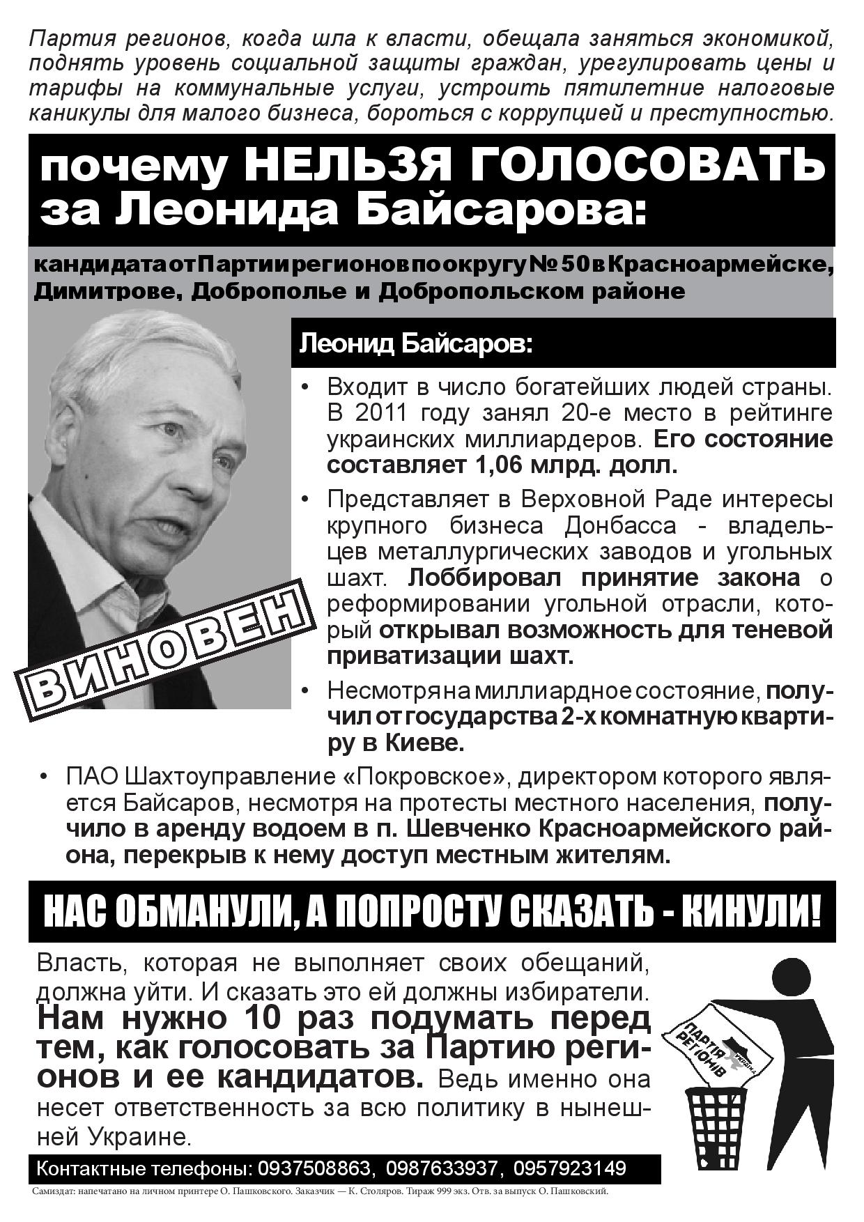Мешканців Красноармійська проінформували про те, що Леонід Байсаров входить до числа найбагатших людей країни і представляє інтереси великого бізнесу Донбасу. Цей кандидат, так само як і його партія, несуть відповідальність за економічні провали в країні та невиконання передвиборчих обіцянок, і в першу чергу – обіцянки про покращення життя українців. Тому, йдучи на вибори, мешканцям Красноармійська не варто голосувати ані за Леоніда Байсарова, ані за Партію регіонів.