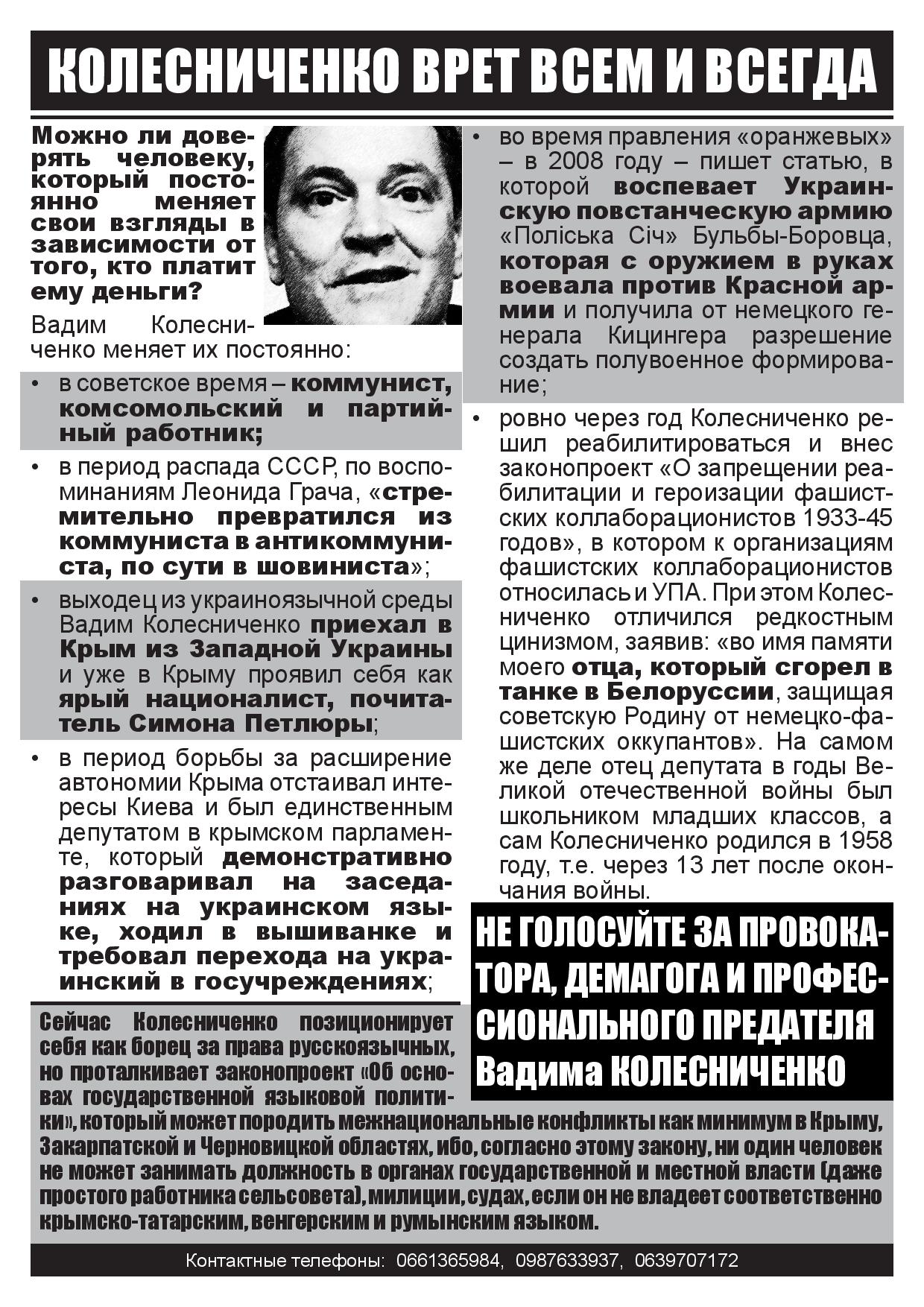 В Севастополі міліцією затримано 5-х активістів кампанії “Помста за розкол країни”, які роздавали в місті російськомовні листівки із закликом не голосувати за Партію регіонів та кандидата від цієї партії в одномандатному мажоритарному окрузі No.225 Вадима Колесніченка – автора законопроекту “Про засади державної мовної політики.”