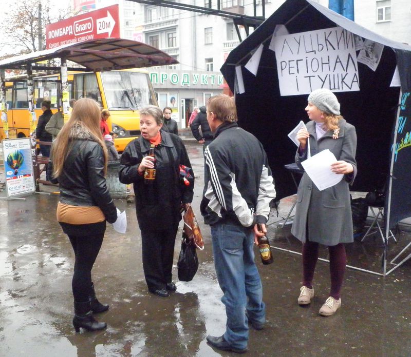 До антиагітаційного намету кампанії “Помста за розкол країни” на Солом’янці підійшов нетверезий молодий хлопець і, посьорбуючи з пляшки пиво, почав доводити активістам переваги Партії регіонів та її кандидата Максима Луцького. Невдовзі туди ж підійшла немолода жінка. Вона посьорбувала з пляшки більш міцний напій – коньяк. Агітуючи за Партію регіонів та її кандидата, вона згадувала злим і зовсім не тихим словом Віктора Ющенка, хоча активісти разів так з десять сказали їй, що не є прихильниками екс-президента. При цьому жінка з коньяком так кричала, що хлопець з пивом не витримав і на очах перетворився у противника Партії регіонів та почав їй опонувати.