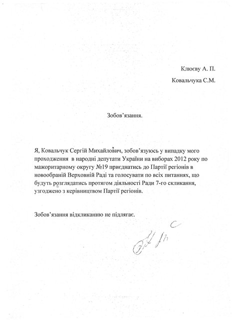 На сторінці групи “Вибори на волині” у соціальній мережі Facebook з’явився лінк на зобов’язання, яке пишуть на ім’я секретаря Ради національної безпеки і оборони України Андрія Клюєва кандидати у народні депутати від Партії регіонів. Отже, в новій Верховній Раді й надалі гратиме оркестр депутатських рук під диригуванням Чечетова.