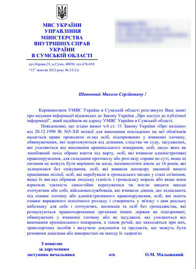 У відповіді на інформаційний запит радіо “Домівки” Управління МВС України в Сумській області не змогло чітко дати відповідь на запитання “У яких випадках представники МВС вилучають SIM-картки у громадян України для своїх баз даних, аби зафіксувати електронні поштові скриньки, закріплені за SIM-картками, а також скопіювати номери телефонів із цих самих карток?” Управління МВС цитує ч. 6 ст. 11 Закону України «Про міліцію», в якому йдеться, що “міліції для виконання покладених на неї обов’язків надається право проводити огляд осіб, підозрюваних у вчиненні злочину, обвинувачених, які переховуються від дізнання, слідства чи суду, засуджених…”.