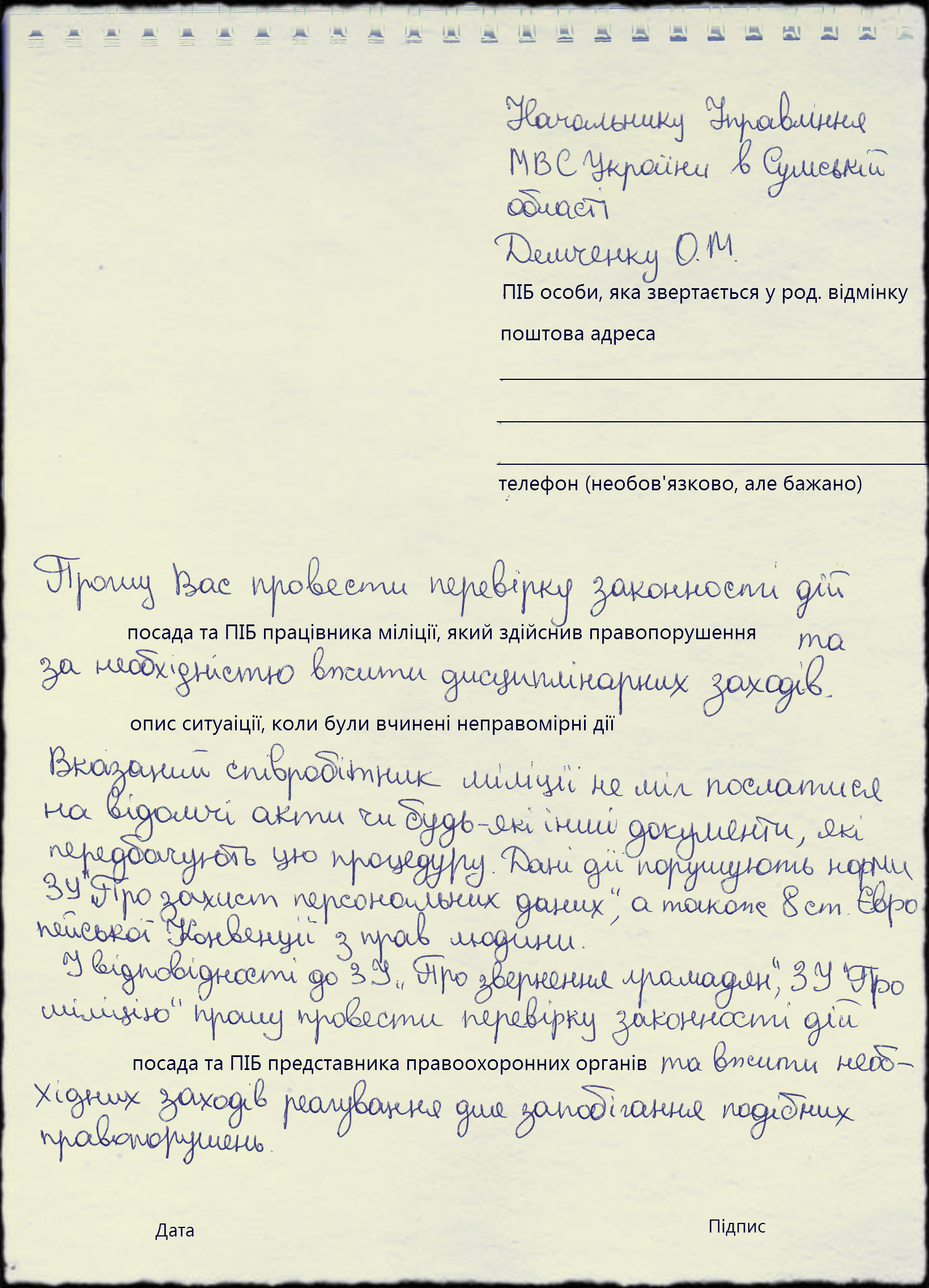 Зрозуміло, що міліціонери будуть усе заперечувати – казати, що ніякої інформації не знімали або що громадяни мали наміри допомогти правоохоронним органам і надавали свої телефони добровільно. Працюйте на випередження і у своєму листі одразу акцентуйте увагу прокуратури, що подібні пояснення нелогічні, оскільки громадяни відвідували райвідділ з зовсім інших причин і вже тоді їх примушували віддавати свої сім-картки.