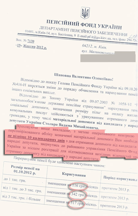Отакий документ надійшов мешканці Києва, яка мала необережність спокуситися на “матеріальну допомогу” кандидата у народні депутати Вадима Столара. Тепер їй за житлово-комунальні послги доведеться платити більше, оскільки подачку їй зарахували як отриманий дохід.