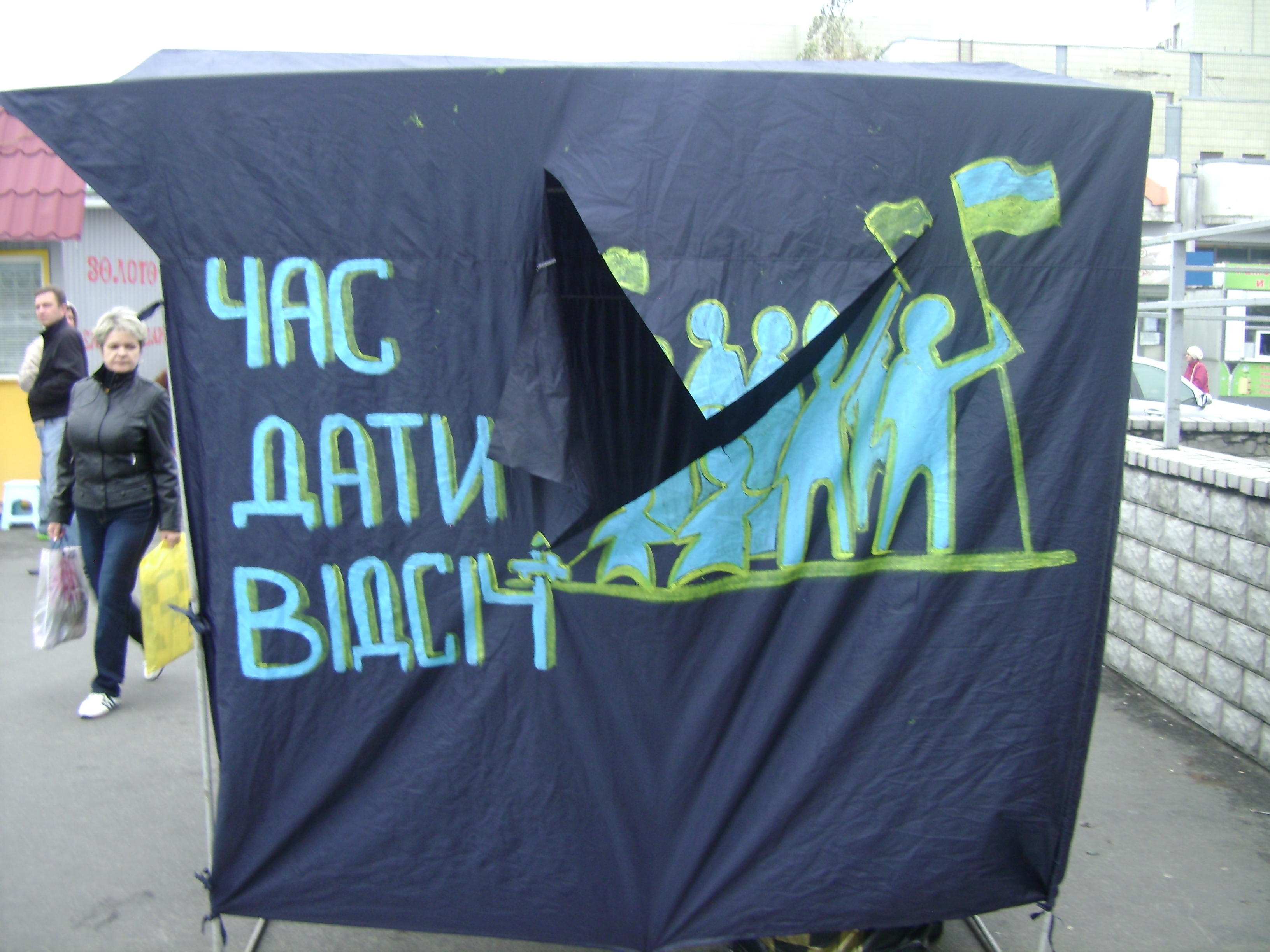 Згодом один з п’яти молодиків підійшов до активістки та почав розпитувати про зміст поширюваних листівок та діяльності антиагітаційного намету. Отримавши детальну відповідь про те, що метою кампанії “Помста за розкол країни” є зниження рейтингу Партії регіонів та її кандидатів і відсторонення від влади тих, хто замість того, щоб вирішувати економічні та соціальні проблеми, намагається розколоти країну, молодик зізнався, що “отримав наказ прибрати намет”.
