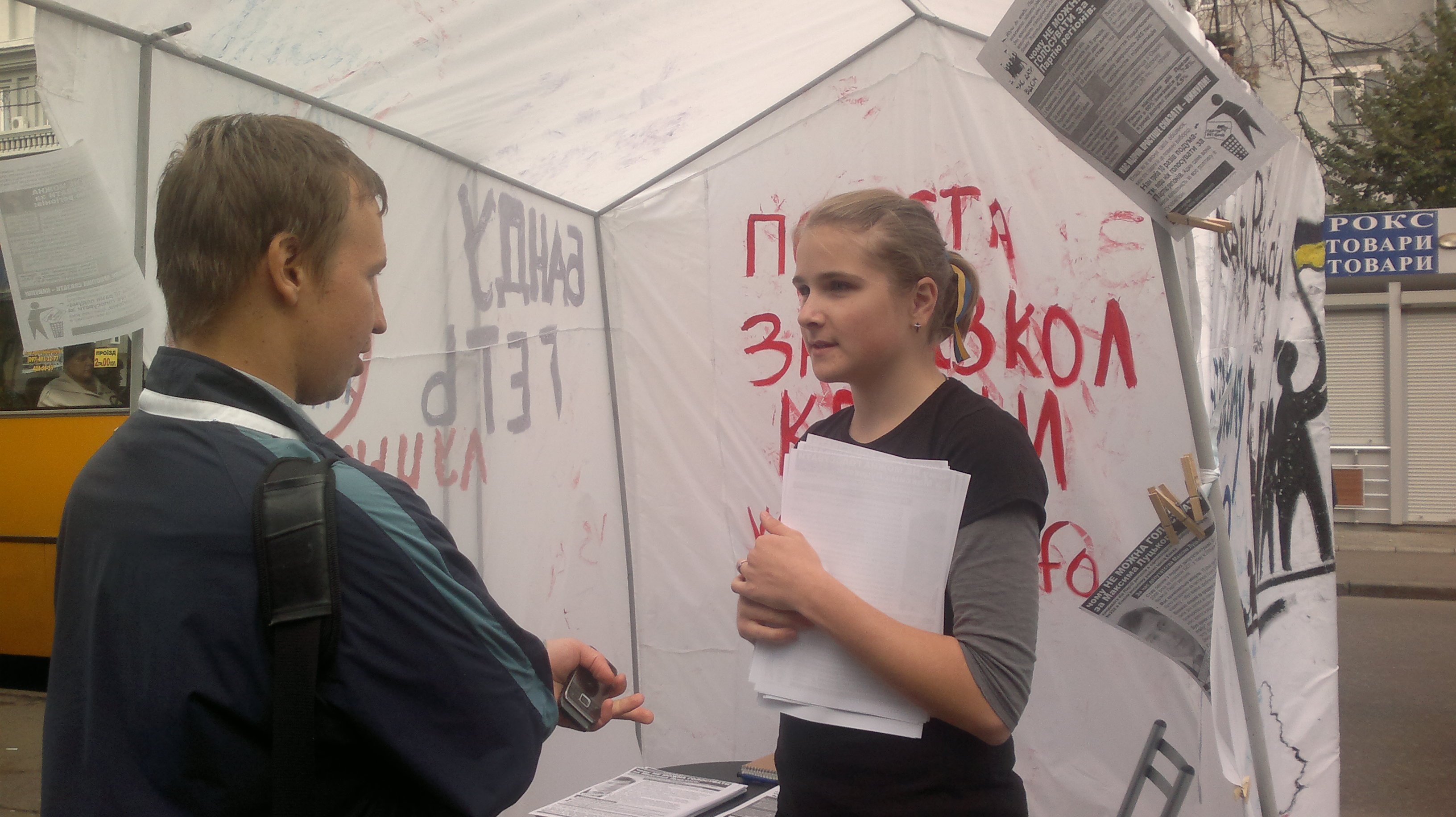 У п’ятницю антиагітаційного намет кампанії “Помста за розкол країни” трохи змінив дислокацію, оскільки зранку, коли активісти прийшли його ставити, вільне від партійних наметів місце на тротуарі було зайняте двома великими автомобілями.