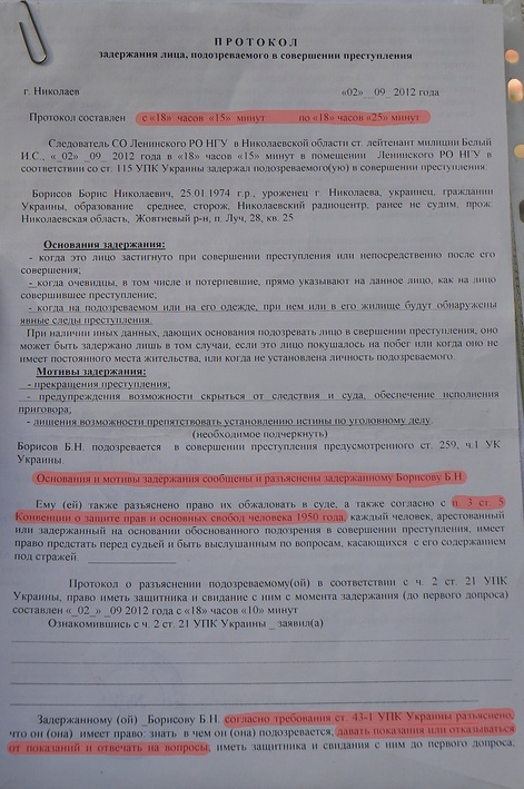Брехню, яку довелось правоохоронцям послуговуватись через розуміння незаконності своїх дій, можна зустріти не лише в цьому документі. В протолі затримання особи, яка підозрюється у скоєнні злочину від 2-ого вересня, говориться, що Борису слідчий роз’яснив положення Конвенції про захист прав і свобод людини 1950 (!) року, статті Конституції і КПК. Проте затриманий запевняє, що нічого окрім суцільної лайки і навіюванням ударами по голові того, що він вчинив злочин за статтею 259 КК Україні, в кабінеті на другому поверсі равідділку міліцонери йому не роз’яснили.