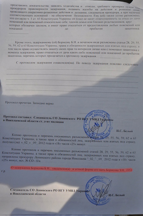 У цьому ж протоколі стверджується, що слідчий повідомив про затримання Бориса його матір, проте, для того, аби з’ясувати, де він, тітці затриманого довелось телефонувати в усі лікарні, морги та райвідділки міста Миколаїв.