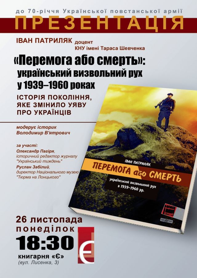 Запрошуємо Вас відвідати презентацію книги відомого київського історика Івана Патриляка «Перемога або смерть», яка відбудеться 26 листопада (понеділок) о 18:30 в Книгарні «Є» (м. Київ, вул. Лисенка, 3).