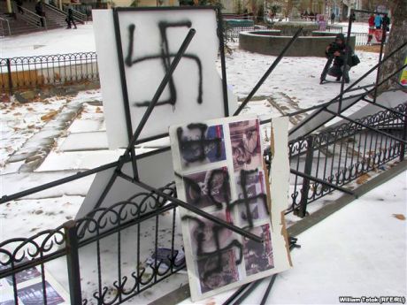 Низка присутніх також долучилася до демонтажу виставки і намалювали фарбою на знесених стендах нацистську свастику.