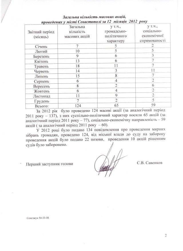 Для порівняння – 2011 року у Севастополі було подано, відповідно до ст.39 Конституції України, 142 повідомлення про проведення мирних зібрань, на що влада відреагувала 11-ма позовами, за 5-ма з яких було прийнято судом рішення про заборону мирних зібрань. У 2010-му ж році організатори мирних зібрань повідомляли про відповідні наміри 174 рази, а судових заборон, за наявними даними (отриманими від того ж джерела), не було.