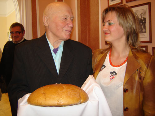 Мирославові Симчичу радіють скрізь. Хліб і сіль від українців Обухова. Праворуч Любов Криворот. Травень 2012 р.