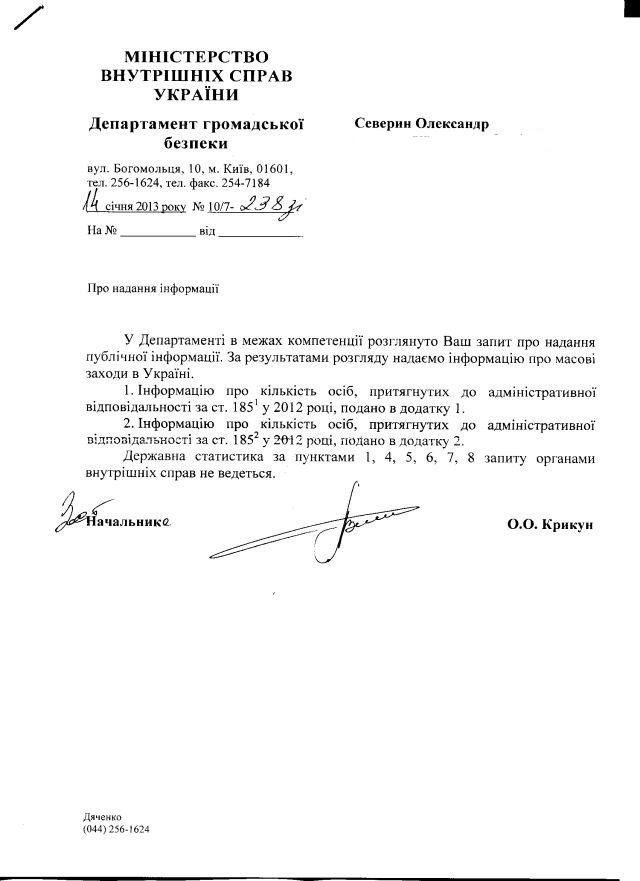 У рамках щорічного дослідження свободи мирних зібрань в Україні “Майдан-Моніторинг” спитав у Міністерства внутрішніх справ про таке (за підсумками 2012 року):