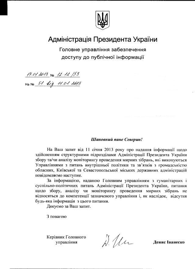 Тут, ясна річ, нам стало цікаво, а що ж роблять з тією інформацією в АП та КМУ, і чи справді лише кілька ОДА регулярно звітуються про мирні протести перед офісами Януковича та Азарова. Ми і спитали (це, для прикладу – в АП, в КМУ – аналогічно):