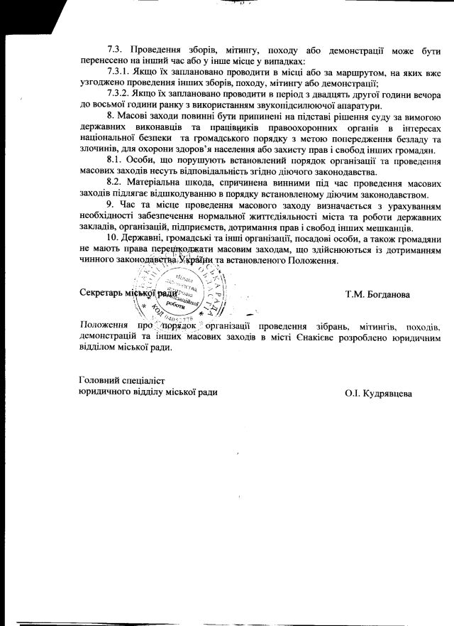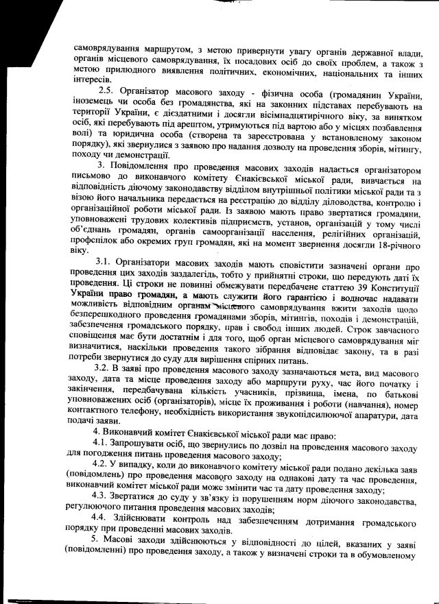 А в таких “порядках” чи то “положеннях”, зазвичай – і визначення строку завчасного сповіщення про мирне зібрання (що за рішенням Конституційного Суду України є предметом законодавчого регулювання), і встановлення для організаторів і учасників зібрань якихось обов’язків, не передбачених законодавством, і свавільне визначення території проведення зібрань, і навіть “право” органу місцевого самоврядування без суду, в адміністративному порядку, обмежити право на мирні зібрання. Для прикладу: