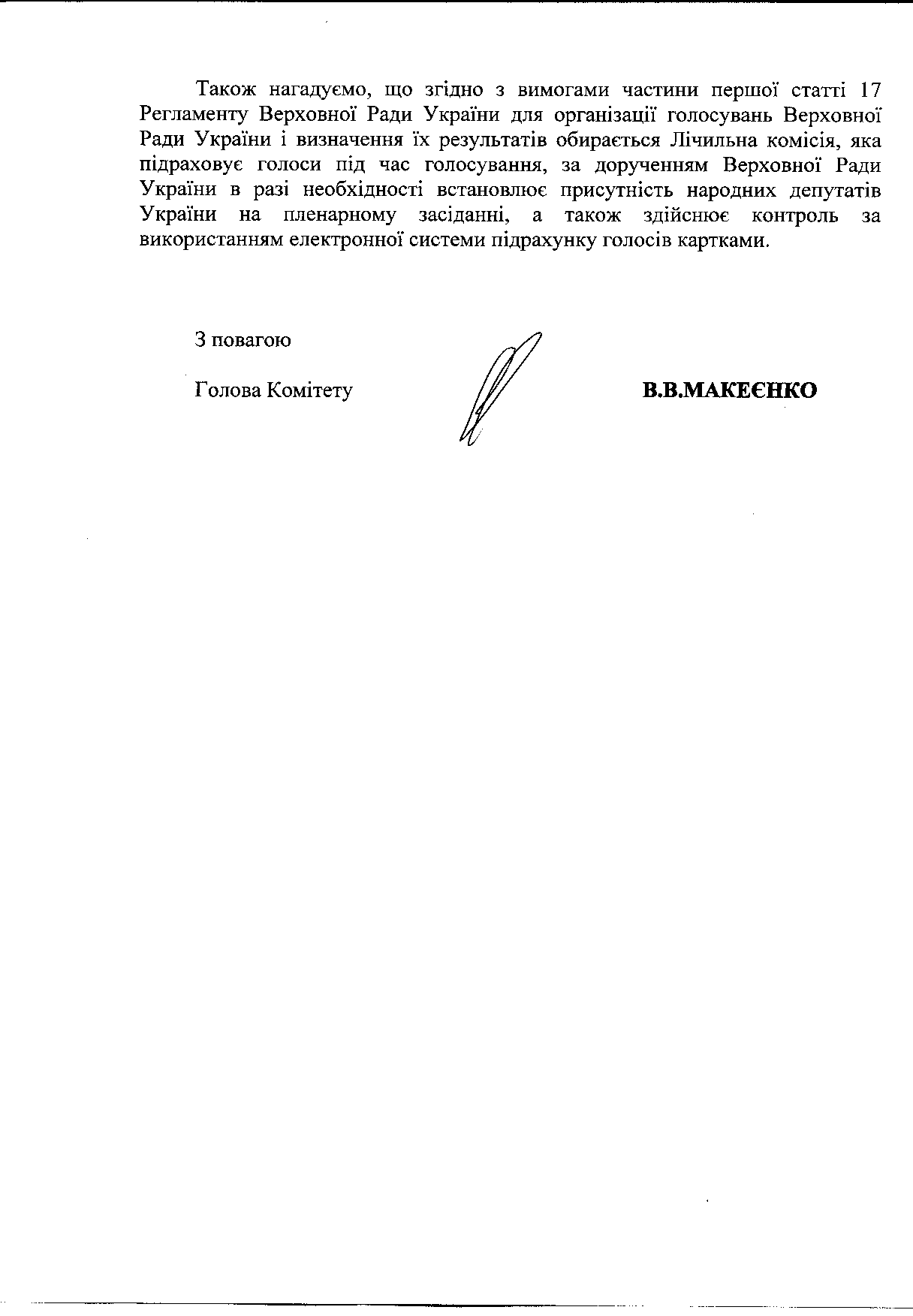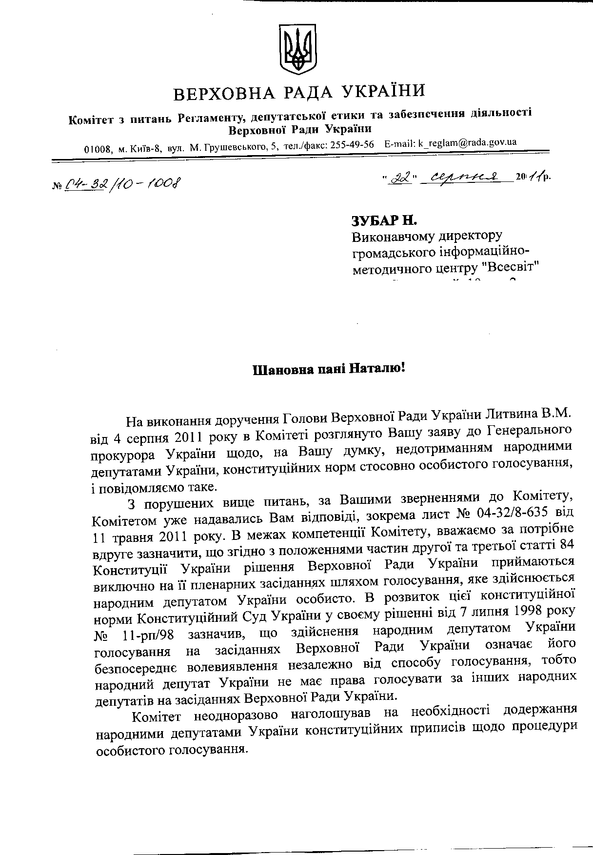 І тепер ми отримали майже одночасно дві відповіді. Одну від голови регламентного комітету В.Макєенко, який вже нас добре запам’ятав, іншу – від Марини Ставнійчук з АП (при тому, що з АП нам вже відповіли місяць тому).